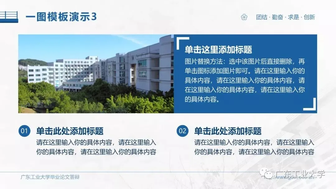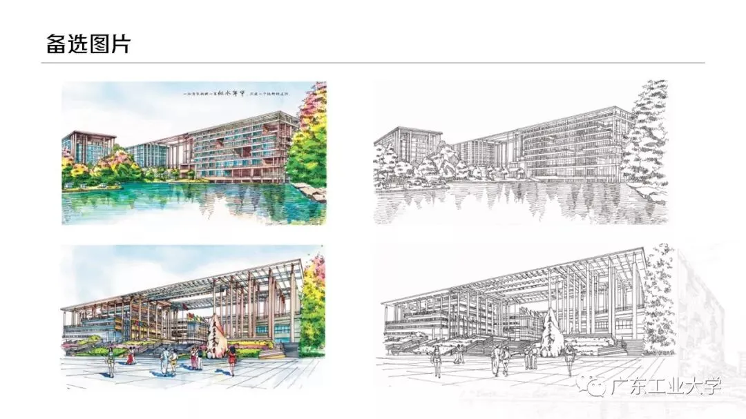 这份模板最具特色的地方是线稿部分。将学校风景绘制成线稿:如封面是图书馆,目录页是教学楼和路标结合,节标题页是连接生活区到体育馆之间的天桥,时间轴页是二饭旁的天桥等等。通过这些别具一格的元素,体现广工特色。