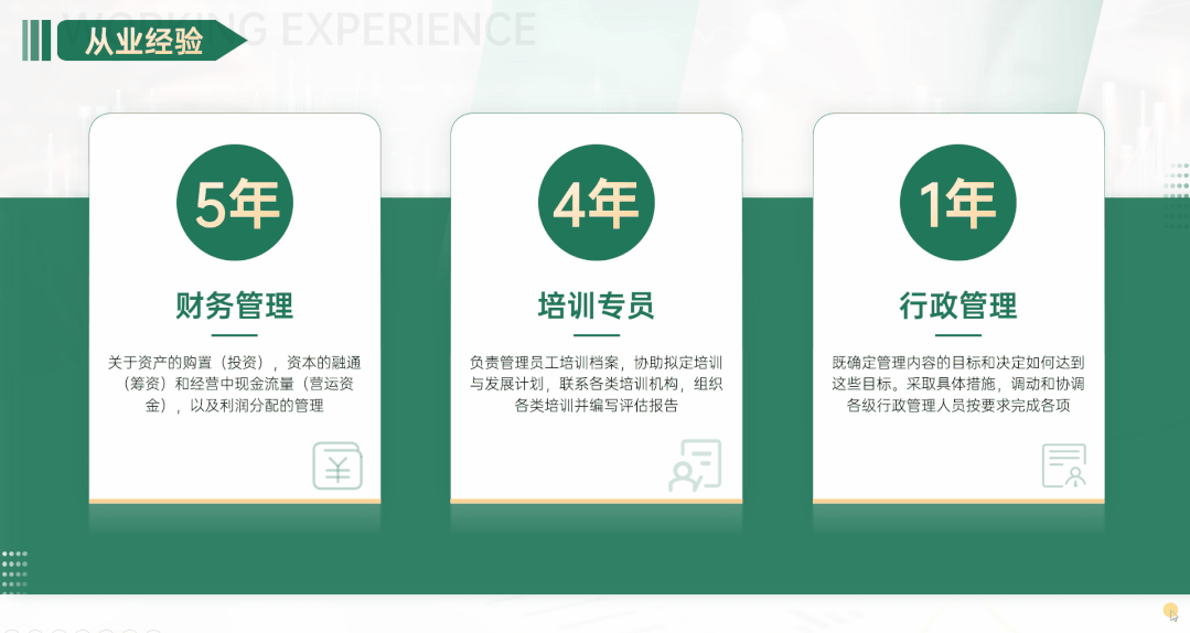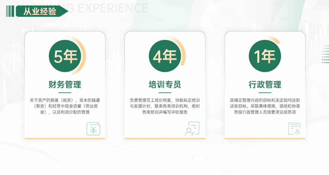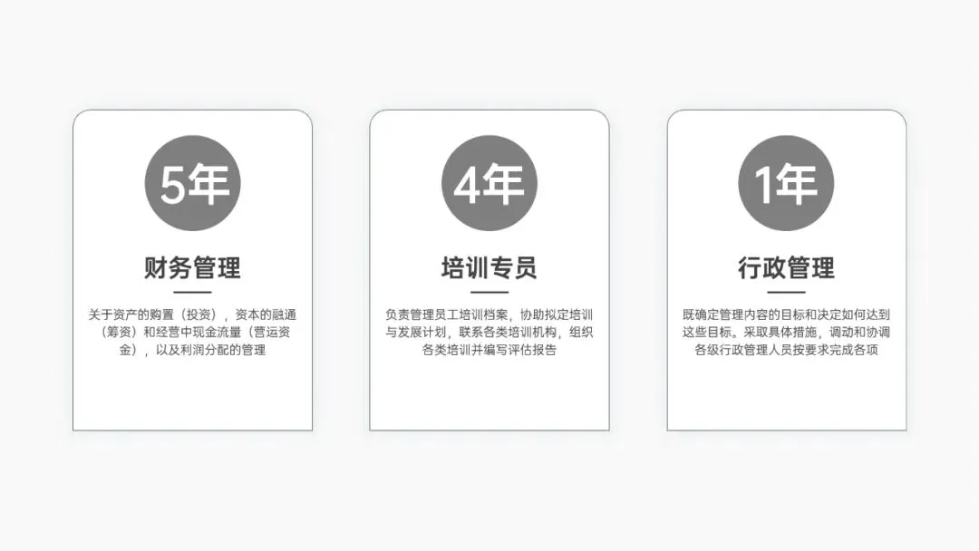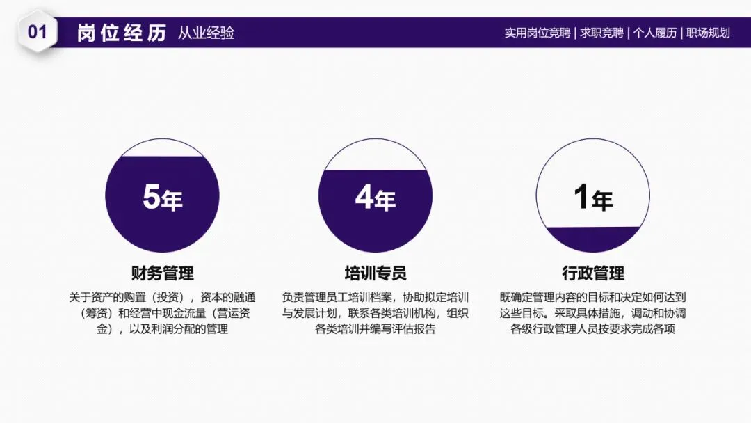 原稿是在圆形里面,用不同大小的填充来表示年份的长短。这个想法很不错,赶紧 Get 起来!我在圆形的外面加了个弧线,看起来就丰富了~弧线这里也沿用了原稿的思路,留了一点小细节,按年份的长短绘制弧线的长短。又增加一丝可视化效果了!底部比较空,找了几个图标来做临时演员,把场面撑起来!最后,在矩形的下方添加上图片,调整矩形的透明度,让背景有多一些纹理。方法有很多种,这里我是利用合并形状功能。让图片跟矩形进行相交,从而得到与矩形等大的图片。两段式内容,我们依旧维持左右排版的思路。但是文字排版上面,有些跌宕起伏了。所以我们还是沿用上一张三段式内容的常规排版,把文字部分排整齐即可。接着延伸上面的色块以及线条元素,让画面保持风格统一。在检查画面的时候,感觉还是太空了。不行,还是得请临时演(图)员(标)!我给内容顶部加上了圆形,利用阴影来营造圆形漂浮在上方的感觉。到这里,我们的改稿就结束啦~我们来看看前后的对比。感觉怎么样呢?有没有一丝丝打开你的脑洞?没有的同学请把文章收藏起来,每天看 3 遍!有的同学,请给小心心啦~谢谢!如果想获取修改后的源文件,可以在秋叶 PPT 后台回复【简历】领取哦!最后如果文章对你有帮助的话,就动动小手给岁岁点点赞、点点在看吧~