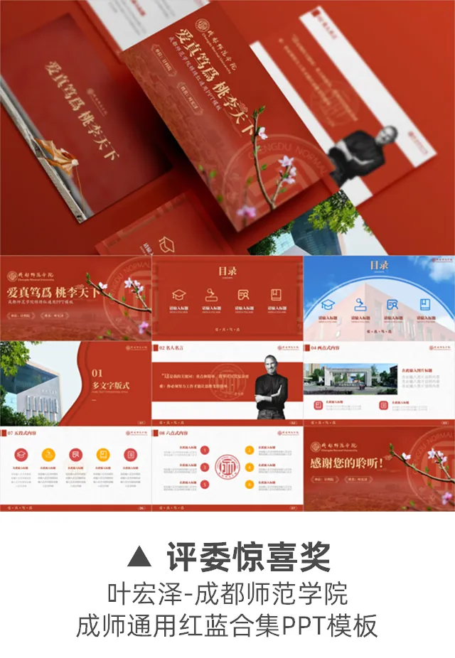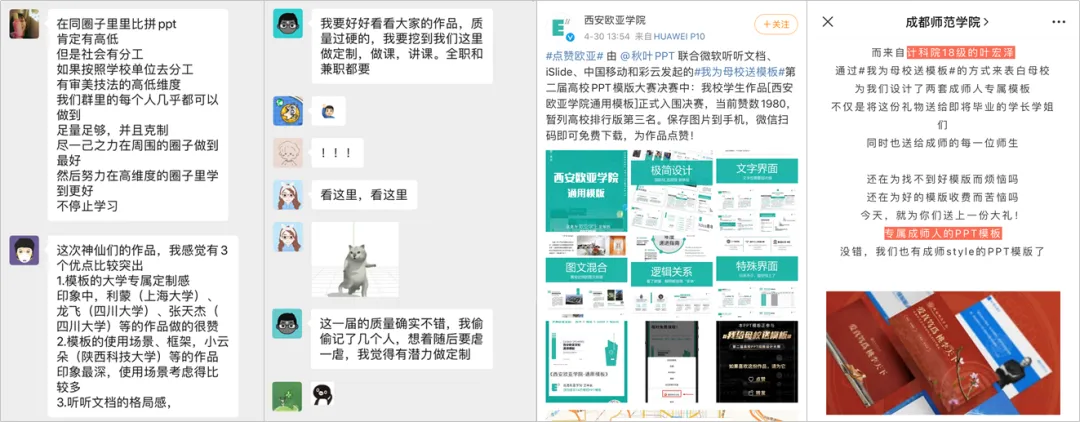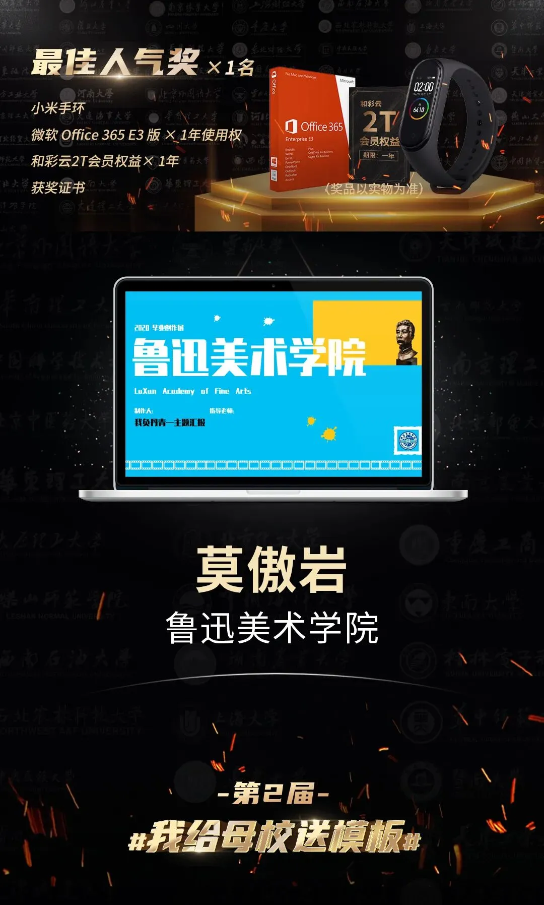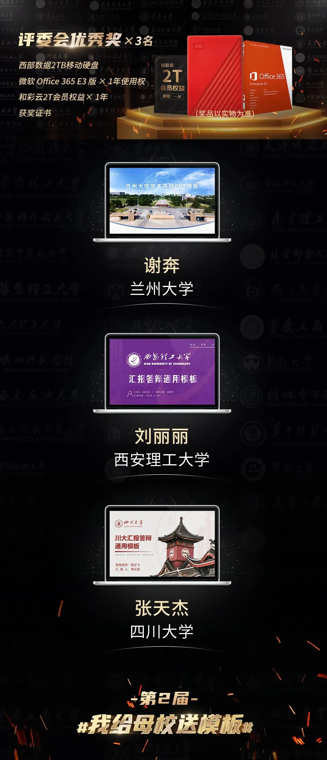 关注星标★不迷路最近持续关注秋叶 PPT 的粉丝肯定知道,我们最近干了件大事!一个月前,我们联合微软听听文档、iSlide、中国移动和彩云发起了第二届#我给母校送模板#大赛。在这一个月时间里,我们一共聚集了全球近 1000 所高校的学子,给自己的母校送模板。作品提交截止到 4 月 20 日,短短 12 天,我们的 PPTer 为母校献上了近 900 份 PPT 模板!每一位选手都将自己的回忆和情感注入自己的 PPT 模板作品和听听文档中,讲述了设计理念与模板背后的故事,打开一份份模板,就好像打开了一份份母校记忆和希冀。通过 6 位专业评委层层初筛后,508 份优秀作品入围决赛,角逐最终的 53 个奖项!过去的一周里,选手们收到了来自全国各地的网友、同学的打 call!@老秦、@Simon_阿文、@Bobbie、@张鹏 等评委老师也来点评了选手们的作品~能因为一个比赛,因为一份 PPT 模板,带来这么多改变真的是太棒了!其他的获奖作品同样优秀,受限于篇幅,我们将在后续推送里向大家呈现!