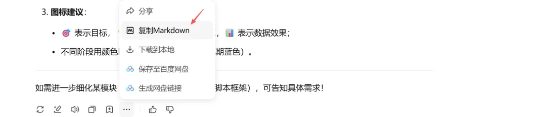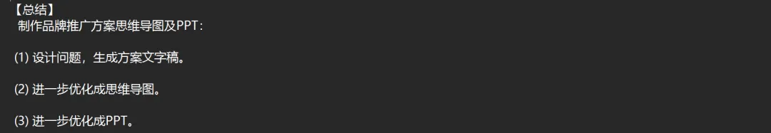 2.进一步优化成思维导图(1) 一份推广方案书,如果只是以文档形式传阅给其他工作人员,非常不直观且比较枯燥。在工作会议中,通常与其他工作人员交流方案,需要以思维导图或者PPT的形式呈现。接下来我们来逐步制作,首先让AI帮我们生成思维导图格式。