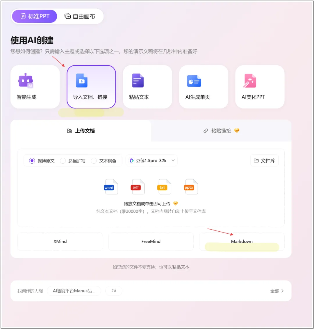 (1) 我们打开网址:https://www.aippt.cn/,单击"立即生成"按钮。选择"markdown"格式导入刚才生成的思维导图格式的文档(即PPT文档的一个大纲)。