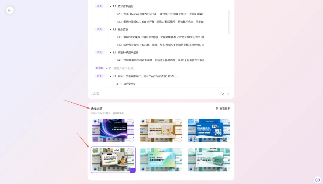 (2) 等待AI工具读取信息概要,如果需要调整则可直接单击文本进行编辑。编辑之后,单击"挑选PPT模板"按钮,PPT主题模板的选择可在查看更多里面选择。