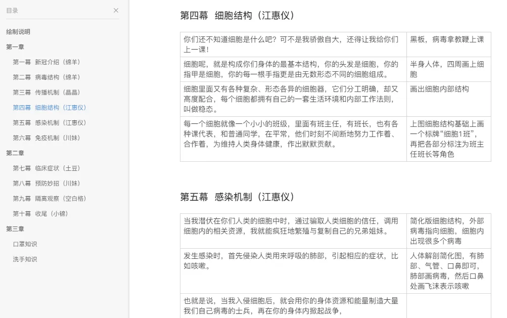 在多人协作的情况下,同样是按段按句来拆分画面,比如这是在《新型冠状病毒的科普与防护 (小学版)》中给手绘师的分工表:
