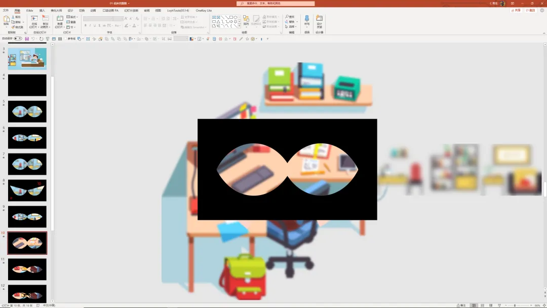 其实制作原理很简单,就是在 PPT 中,做一个掏了两个孔的黑色蒙版,底下一张模糊的图来回移动而已,但却能达到很好的代入效果。