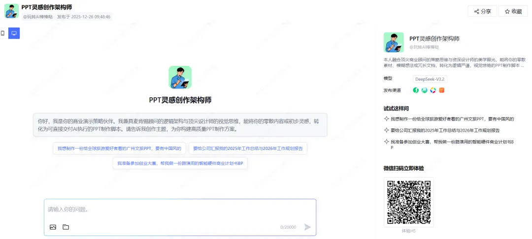 如果你也厌倦了在混乱的素材与紧迫的Deadline之间独自挣扎,如果你也相信,那些真正重要的想法值得被更清晰、更动人地呈现——那么,请让我给你浓重介绍【PPT灵感创作架构师】智能体。让我们借助它,让AI听懂你的言外之意,并替你说出那些尚未成形却至关重要的想法,并一起快速创作高质量的PPT方案吧!