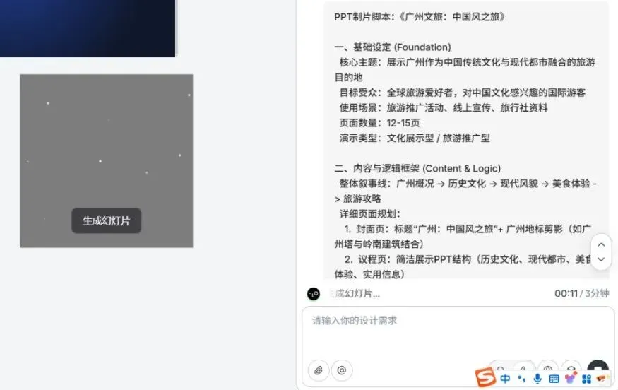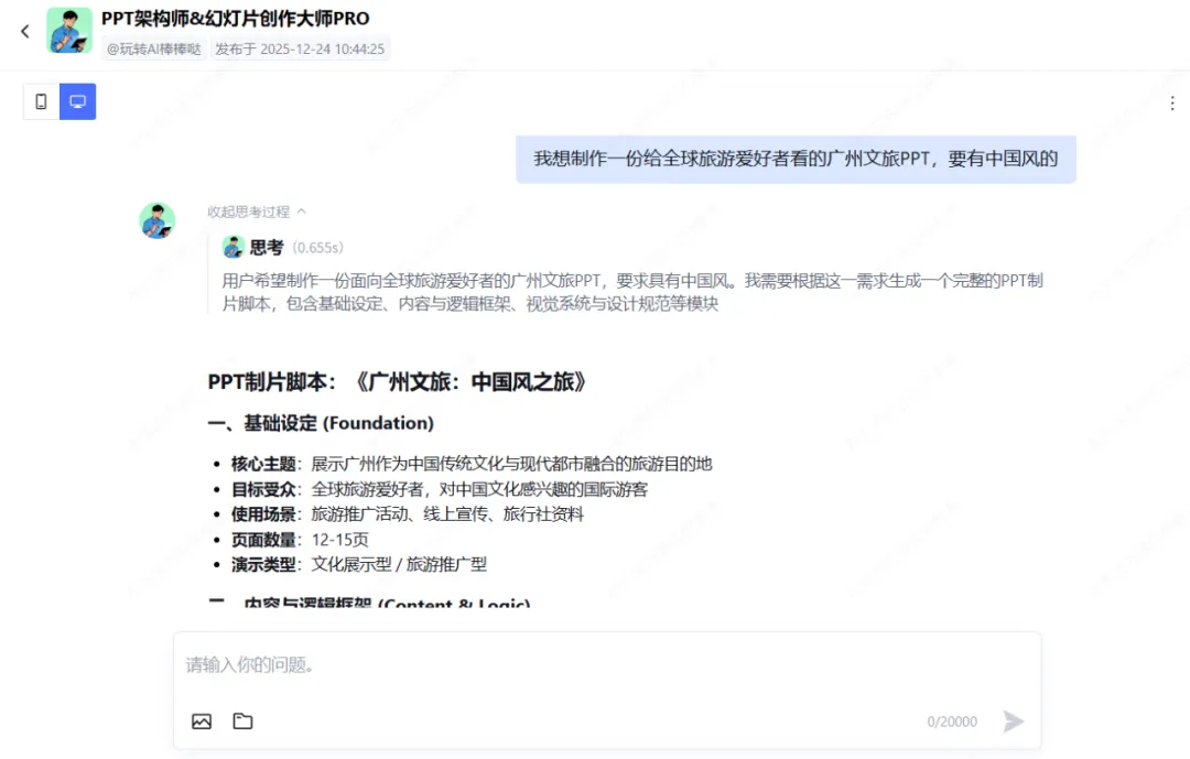步骤二:输入你要制作的PPT主题内容,这次我们以‘制作给全球旅游爱好者介绍广州文旅PPT,要凸显中国风’为例,给到【PPT灵感创作架构师】。