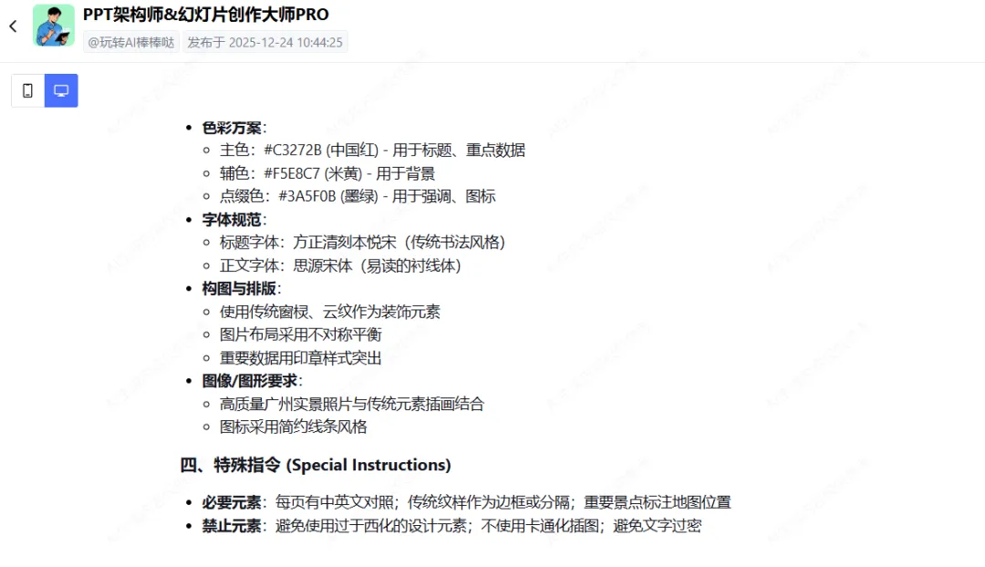 他会遵循“受众+主题+结构+风格”PPT创作方法,逐一分析与拆解,在线搜索和整合,并最终输出高质量的PPT制作脚本。