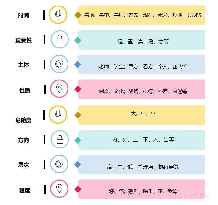 其实无论是逻辑图还是思维导图,想要运用好,都需要先建立逻辑思维。如果没有整理出思路,就算有逻辑图,也很难搭配出合适的内容,信息缺失会给观看者造成困扰。 看了这段文字,我们似乎对青年教师比赛有了了解,但是涉及到材料要提交什么,比赛怎么比等更深入的问题时,如果仅仅用文字来表达,就需要用大篇幅来进行说明,如果换成思维导图是怎么样的呢? 组织好逻辑思维之后,可以很清晰的了解比赛的过程。当然还可以进行美化。无论是对自己讲解还是听讲者,都能很好的接收到信息。这就是逻辑思维带给我们的好处。 当然逻辑思维也是可以进行培养的,本质就是:有条理的整理和组织信息。 就是根据主题,然后往下进行拓展。先建立出树干,然后再不断填充上树叶。 举例:电影、小说、故事等是否能引人入胜,清晰的逻辑脉络是观众看懂看透的前提。而内容过多糅杂,甚至是没有逻辑,就是我们常说的看不懂了。逻辑我们是可以根据相关内容来进行分类的: 因此,建立逻辑思维,多多使用逻辑图和思维导图,学会有效的运用语言逻辑,调理清晰更能有效的帮助我们将信息展示出来。 那么,有了好了逻辑思维之后,其实首要的还是学会运用思维导图,比如mindmaster ,百度脑图等等。逻辑图:比如PPT自带的智能图形。 我们在使用逻辑图的过程中一般会碰到三种情况:改变数量,改变大小,改变颜色。 根据制作需求,选择合适的逻辑图,可以进行颜色和数量的调整。 在使用思维导图的过程中一般都可以挑选模板,当然也可以相应进行调整: 所以,我们在PPT中使用逻辑图和思维导图,建立好的逻辑思维是尤为重要的。尤其是参赛的PPT课件,更是要投入满满的心思,在限定的场合和时间内,如何高效建立信息传递就显得非常重要。来源:网络