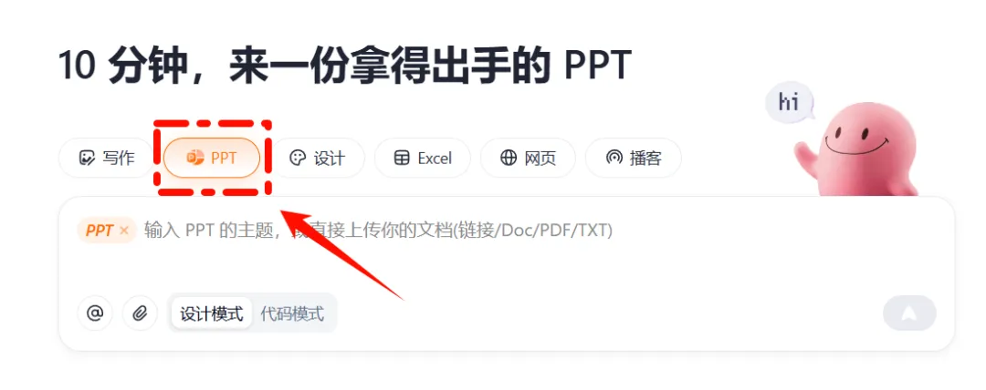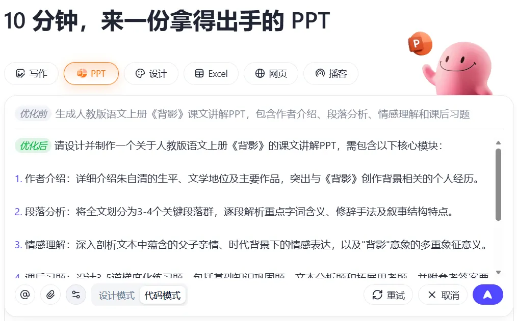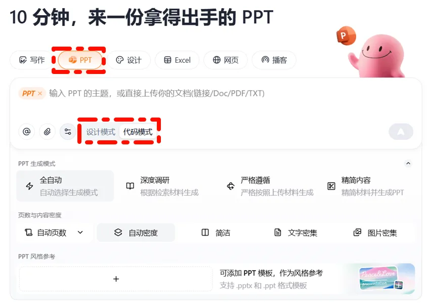 3. 两种模式可选:设计模式(生成图片格式PPT)和代码模式(生成可编辑PPT)