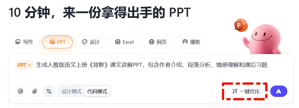 然后点击"一键优化",系统会自动完善提示词。确认后发送,大概等1-2分钟,一份完整的PPT就出现在界面右侧了。想想以前要做这么一份课件,翻教参、找图片、设计排版,少说也得两三个小时,现在几分钟就有了一个不错的初稿,确实省心不少。