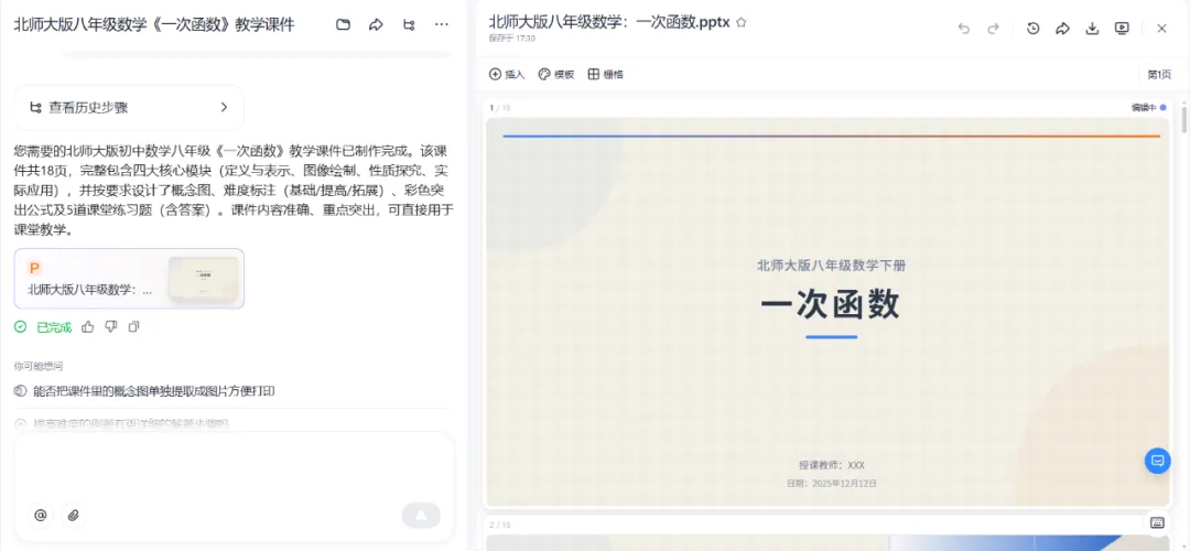 数学PPT:输入"生成北师大版初中数学八年级《一次函数》课件,包含定义、图像、性质及应用例题"。生成的PPT不仅有清晰的概念讲解,还自动配上了坐标系图示和典型例题,甚至贴心地准备了课堂小结和练习题。