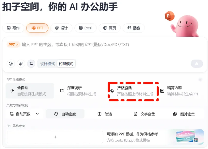 特别是当你手头已经有现成的教案时,可以直接上传,选择"严格遵循"模式,Coze会按照你的教案结构生成PPT,更加贴合你的教学思路。