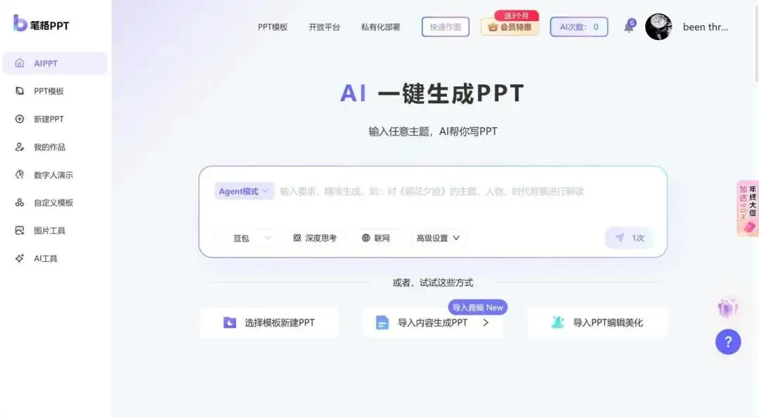 笔格PPT是135编辑器旗下的一款AI赋能的颠覆性在线制作PPT的网站,用户只需输入所需的PPT主题,AI就能够一键生成内容大纲并辅助完成PPT的设计制作。登录有免费生成和下载次数