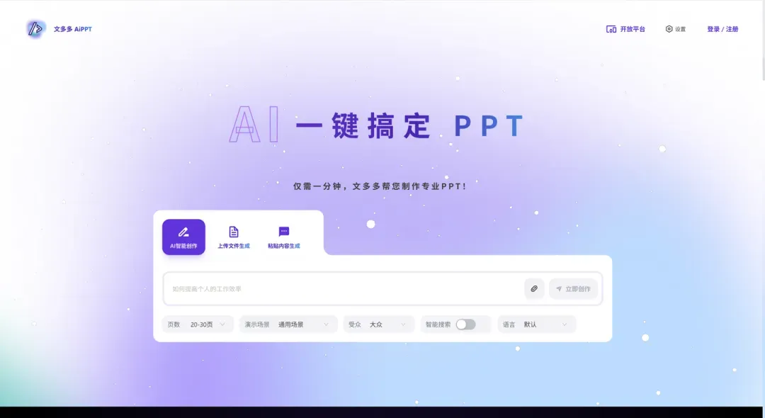 文多多AIPPT是一款AI智能PPT生成工具,支持输入主题或上传文档一键生成专业演示文稿,提供海量模板、在线编辑及智能排版功能,大幅提升制作效率。