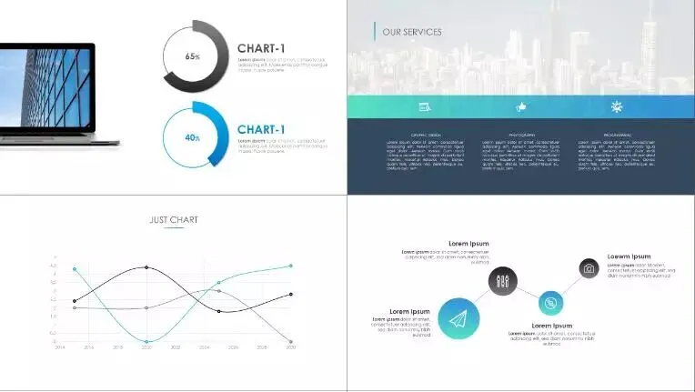比如公司的主色是蓝色,那么,可以在蓝色调的模版中选择一款合适的进行替换。