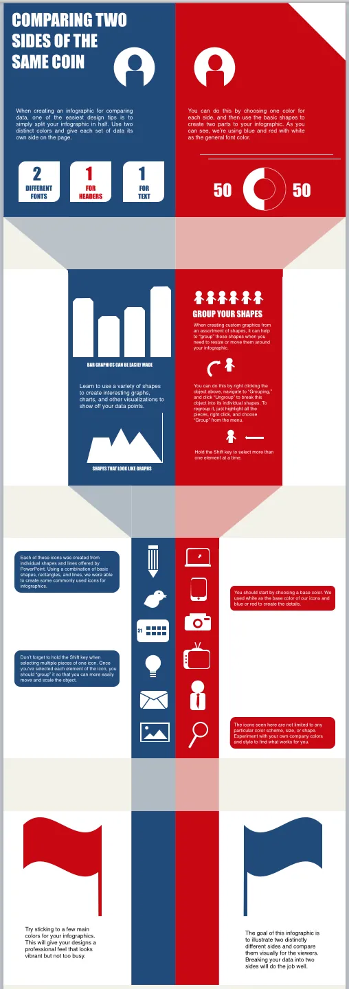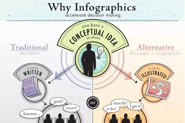 例如,下图解释了为什么要使用 infographics。左右分开,把传统模式和图解模式做对比。