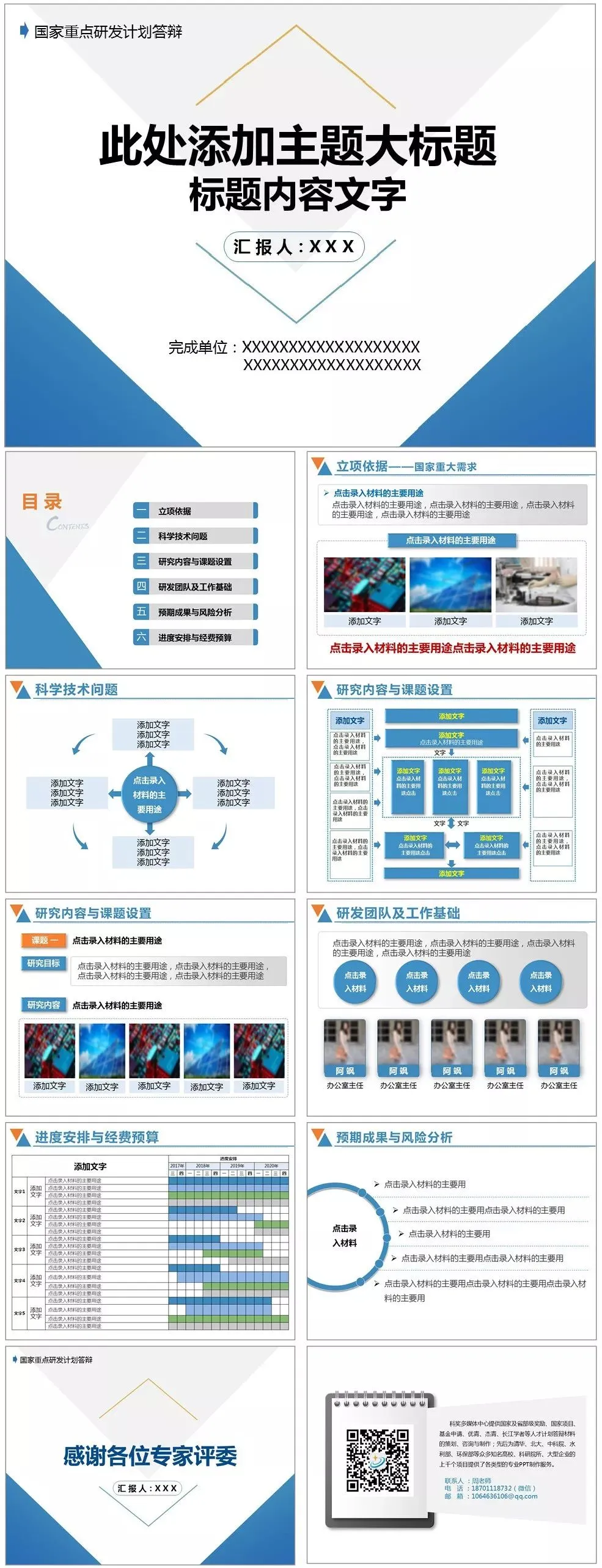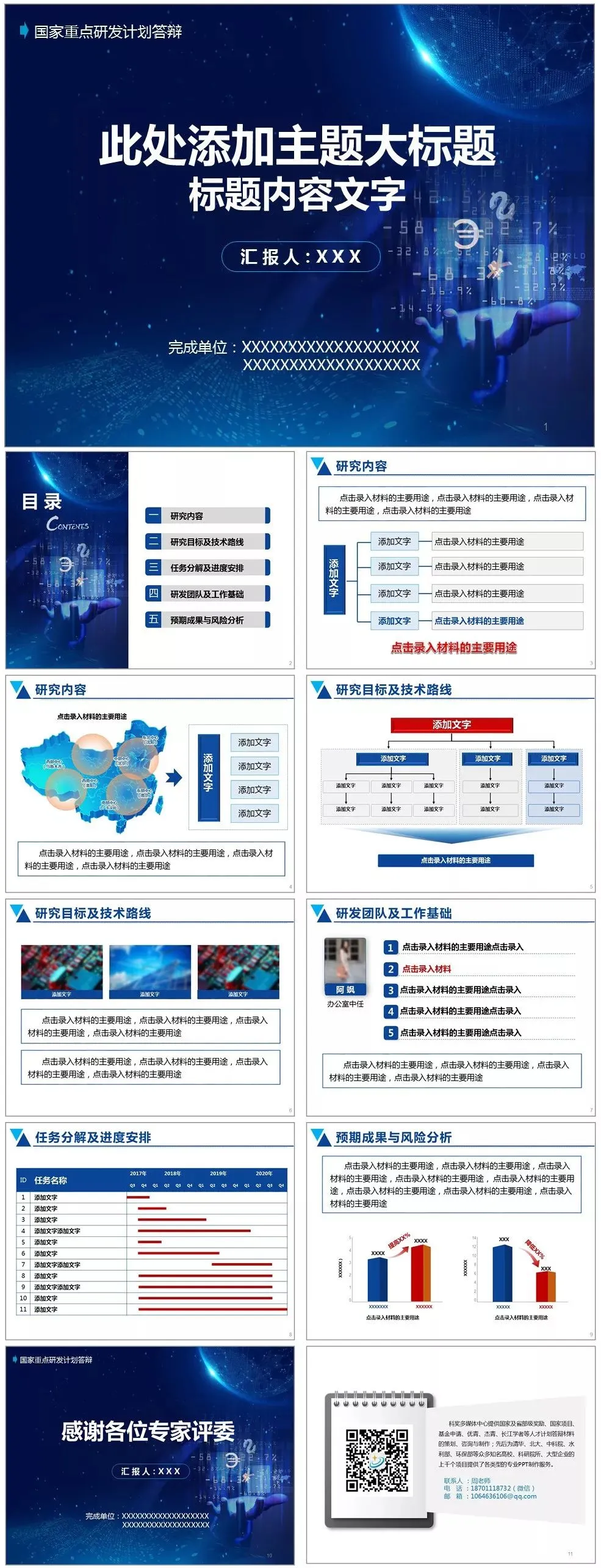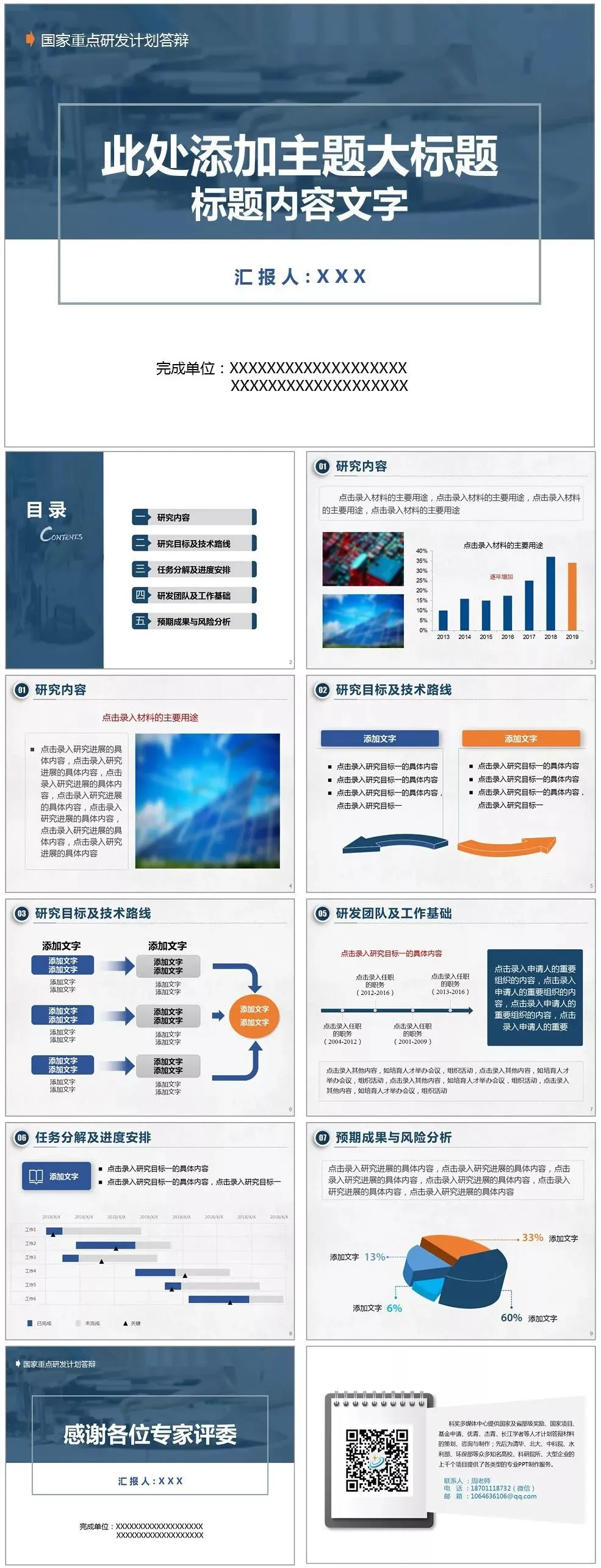 模板说明:本模板采用灰蓝色调,比较低调,用于项目申报答辩!内页设定为重点研发常用内容,全部内容可自行修改。共11页,内页版式设定全部内容可在PPT里自行修改。