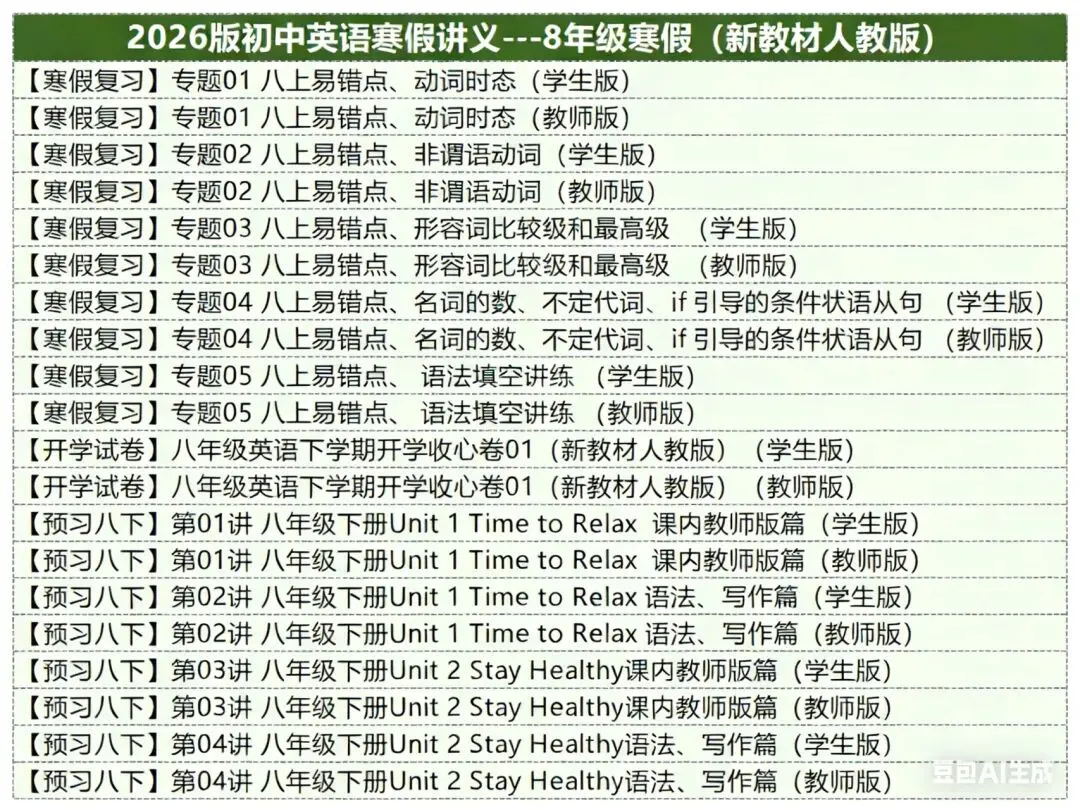 ②2026版8年级寒假讲义,复习+预习模式,教师版❗学生版,讲练结合,适合寒假使用,复习部分主要是上册的语法,预习部分为八下前两个单元,包括课文,要点精讲、语法、词句、小练、等送学生教材课本