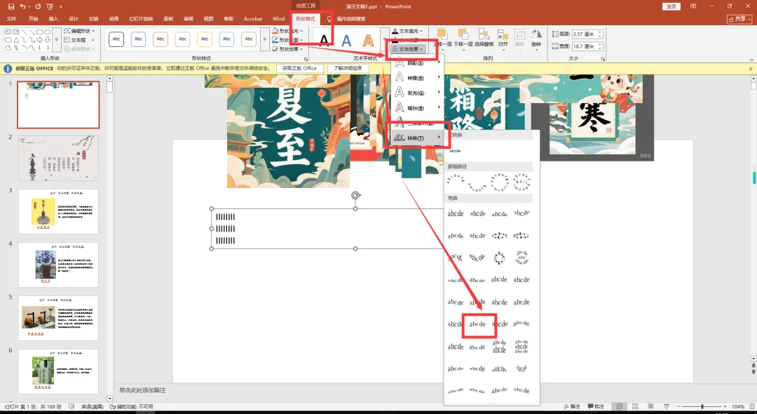 3、找到文本框的形状格式--文本效果--转换--朝鲜鼓,把文本框拉大。