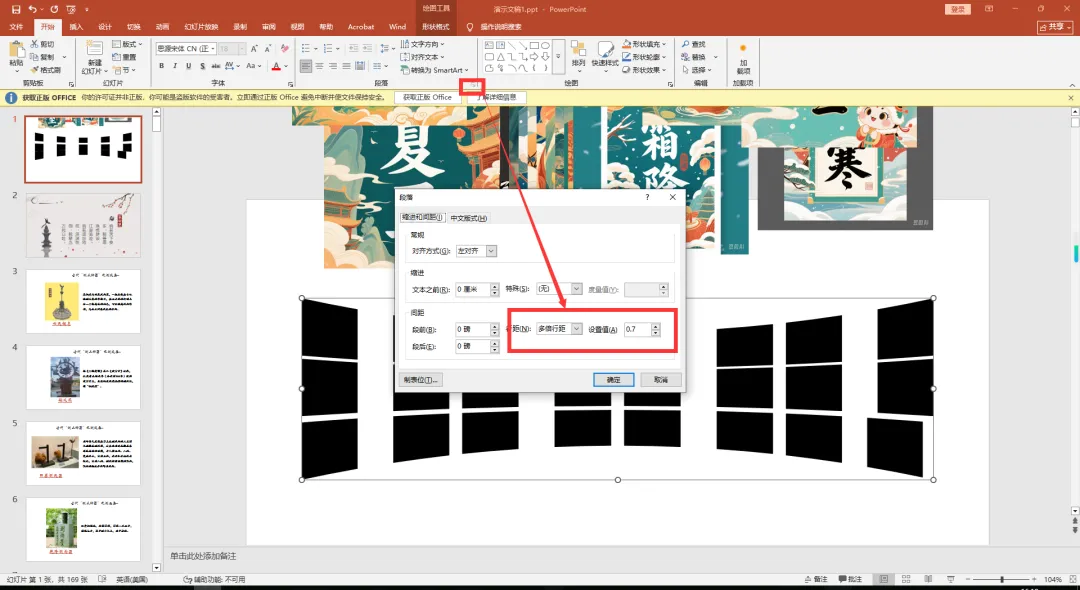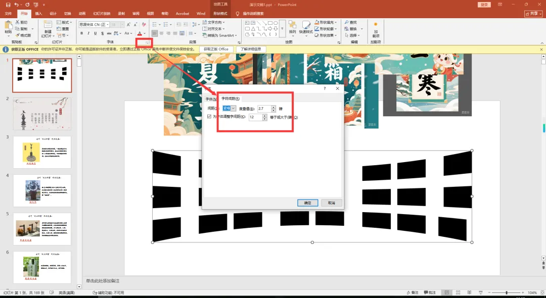 4、文本框里的图案间隙还很宽,选中文本框,字体--字符间距--紧缩--2.7磅;段落--多倍行距--0.7倍,。