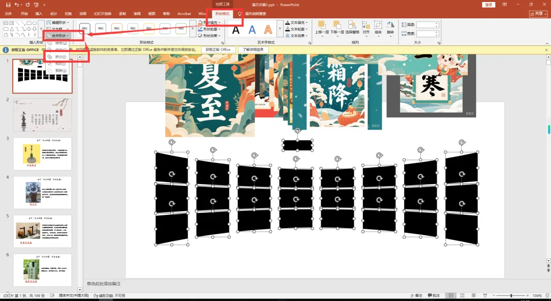 5、插入一个矩形,同时选中插入的矩形和文本框,合并形状--拆分,手动选中文本框中某些图形,拖动调整文本框里边每个图形的间距,使图形更加紧凑。