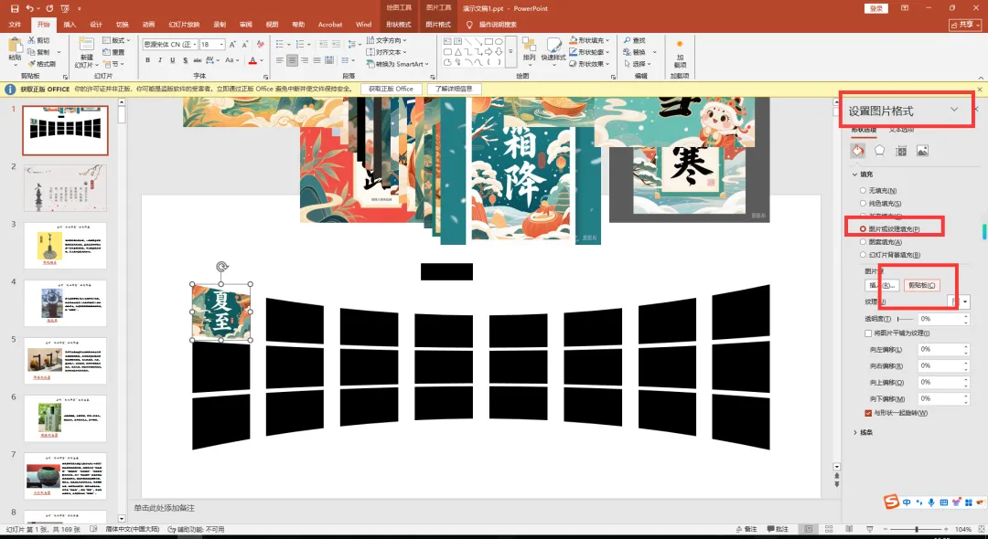 6、选中一张图片,CRL+X剪切,选择文本框中某一个图形,右键设置形状格式,打开设置图片格式--填充--图片或纹理填充--剪切板。依次为所有图片进行此操作。
