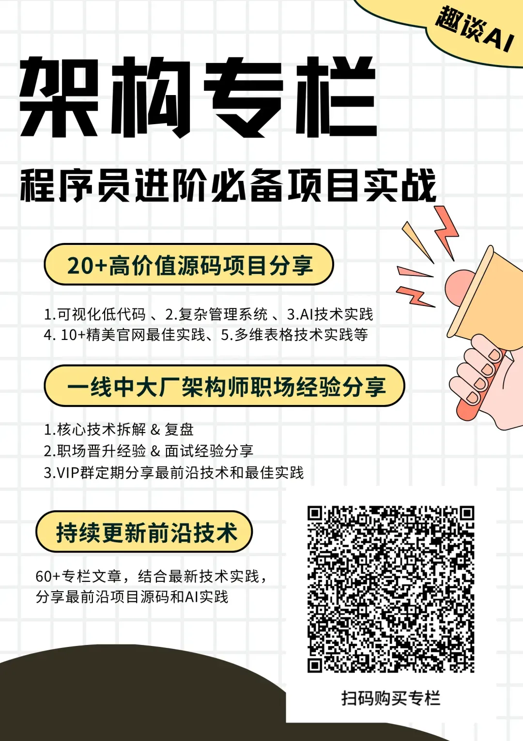 最近推出了《架构师精选》专栏,会分享一线企业AI应用实践,并和大家拆解可视化搭建平台,AI产品,办公协同软件的源码实现。