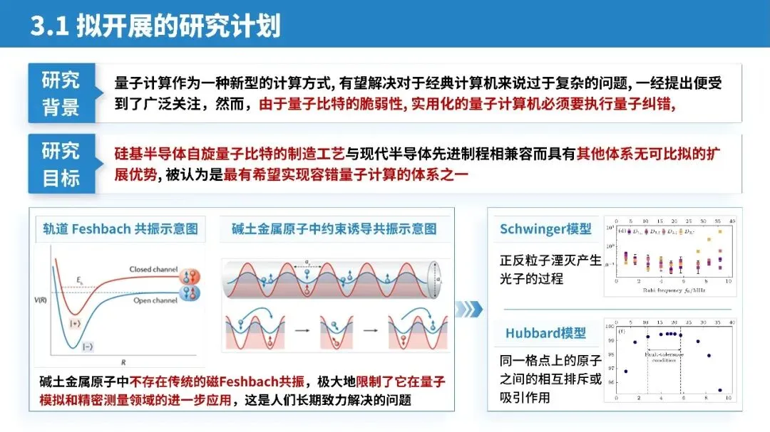 1. 叙事逻辑清晰,完美匹配评审框架模板严格遵循“个人基础-学术成绩-研究规划-支撑平台”的经典架构,并将复杂的量子物理研究,转化为 “比特初始化→精准操控→纠缠测量→容错计算” 的递进式攻关链条。这种清晰的逻辑主线,高度契合国家级人才项目对 “系统研究能力”与“清晰发展路径” 的评审标准,便于评委快速抓住核心贡献与潜力。