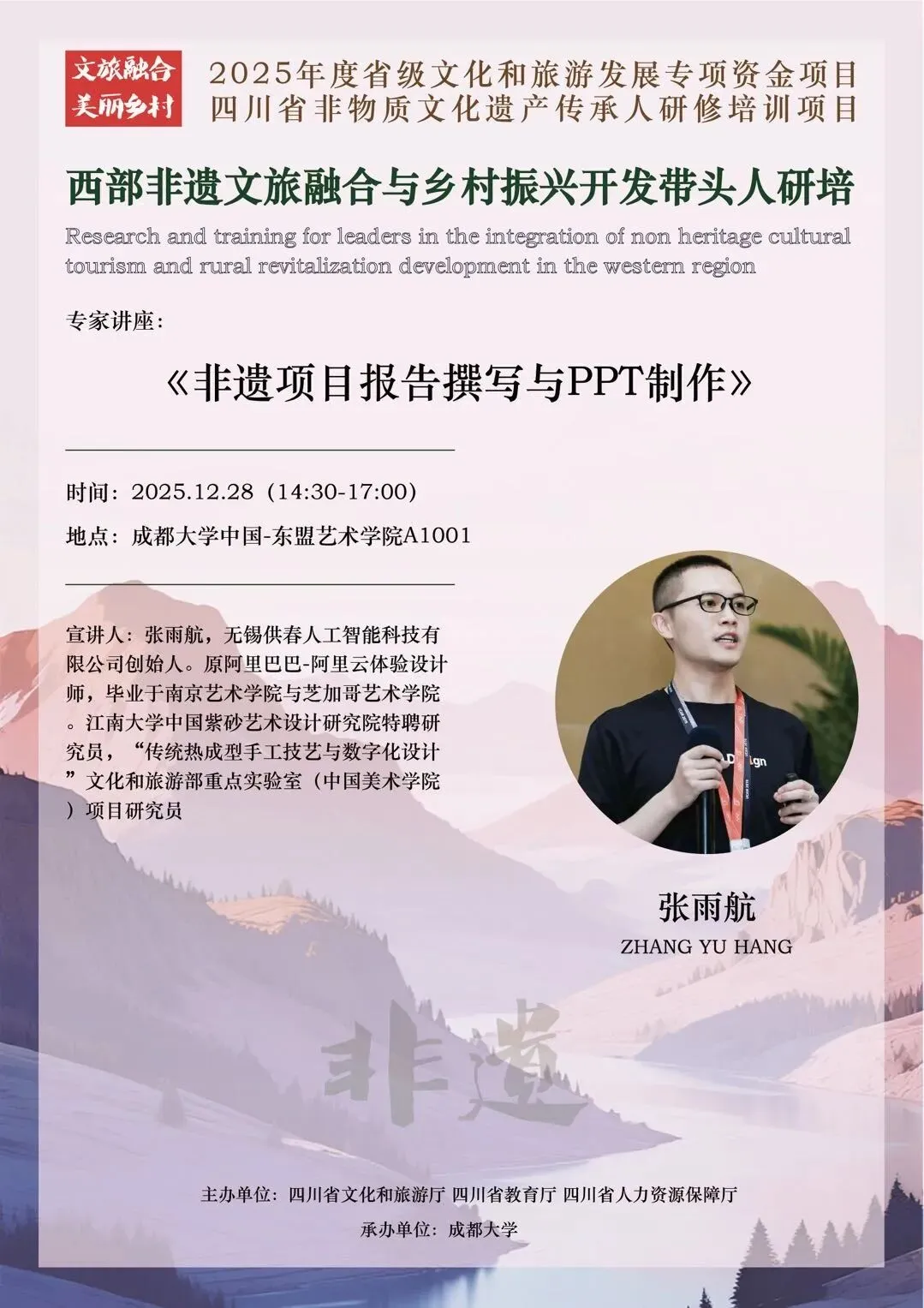编者:《西部非遗文旅融合与乡村振兴开发带头人研培班》于2025年12月19日正式开班,有幸邀请到来自全国的文旅政策、非遗研究、文创品牌、乡村文旅领域的专家学者和工艺大师,围绕 “一县一品” 深耕非遗创新转化,培养兼具创新思维、市场意识与实操能力的开发带头人,助力西部乡村振兴与非遗特色产品打造。张雨航