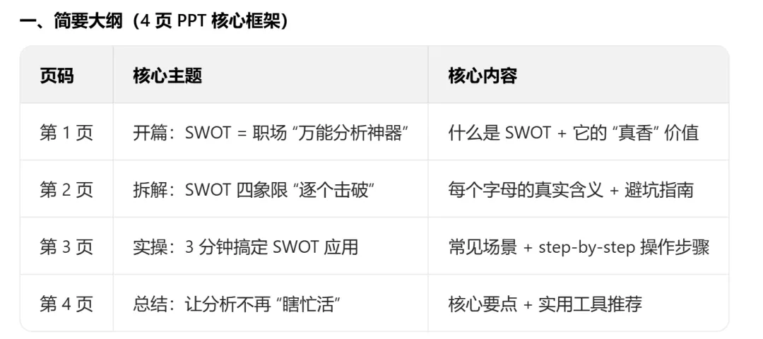 从这个例子中,我们能清晰看到简要大纲只明确了每页核心要点,缺乏具体文字内容。这就导致在最终呈现的PPT中,文字内容可能不符合我们的预期。