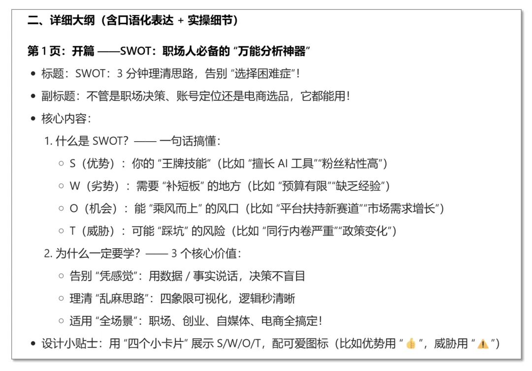 而【详细大纲】则会包含每一页非常具体的文本内容,这些内容就是要放到页面上的文字,可以精准的控制住。给大家看一个例子。