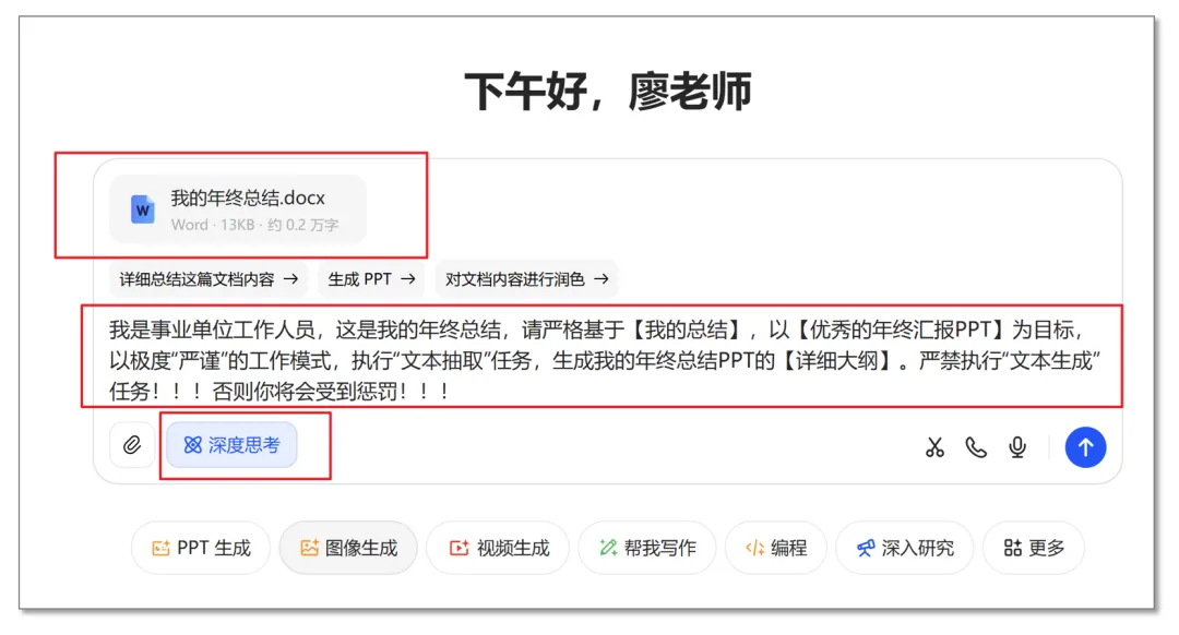 现在,我们手上已经有了这篇自己写好的年终总结的文档(word或pdf格式都可以)。把它作为附件上传给「豆包」,然后发出下面的指令。注意:一定要开启【深度思考】!