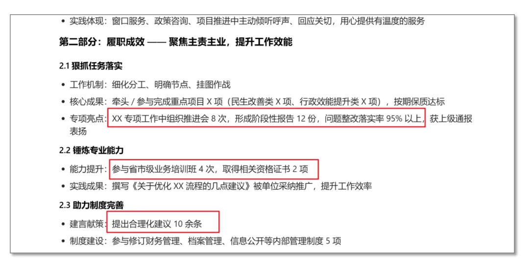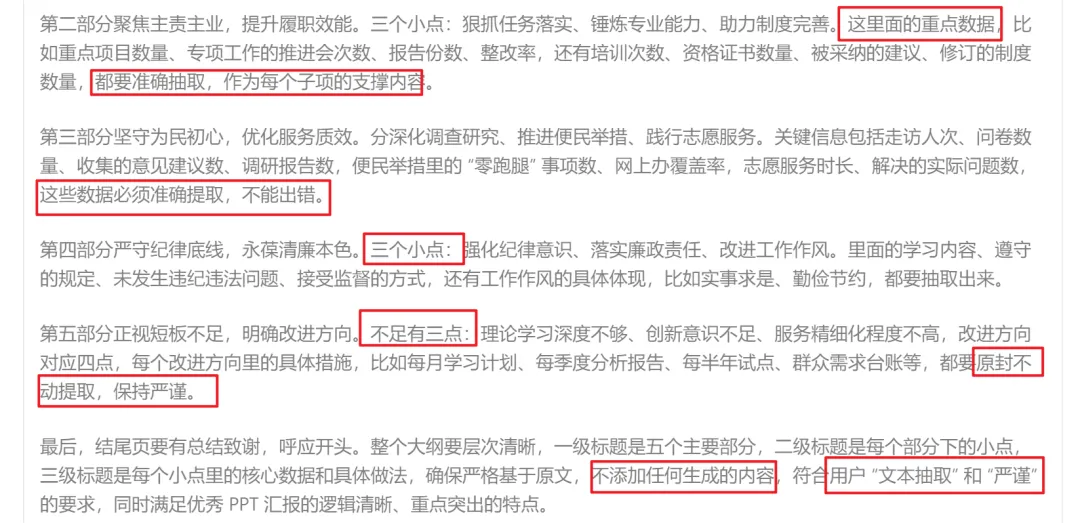 大家看到「豆包」的思考过程中我红色标记的文字了吗?Get到了精髓了吗?这些红色文字说明了什么?说明「豆包」严格遵守了我们指令中【严谨】的约定,自己都在提醒自己要【原封不动提取】,【不能生成新内容】,重点数据全部从年终总结中准确抽取,没有任何偏差。