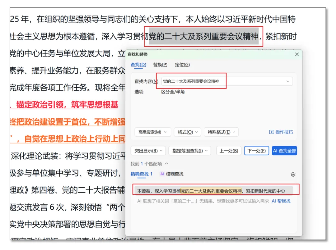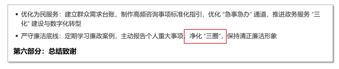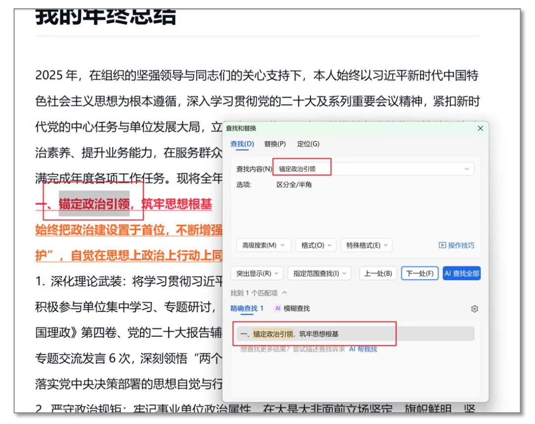首先,可以随机选择一些文字,比如【锚定政治引领】【永葆清廉本色】【习近平新时代中国特色社会主义思想】【党的二十大及系列重要会议精神】等等,你认为非常重要的文字,去你的年终总结中搜索这些文字!如果是「文本抽取」任务,文字应该是「原封不动」的。比如下面这些示例: