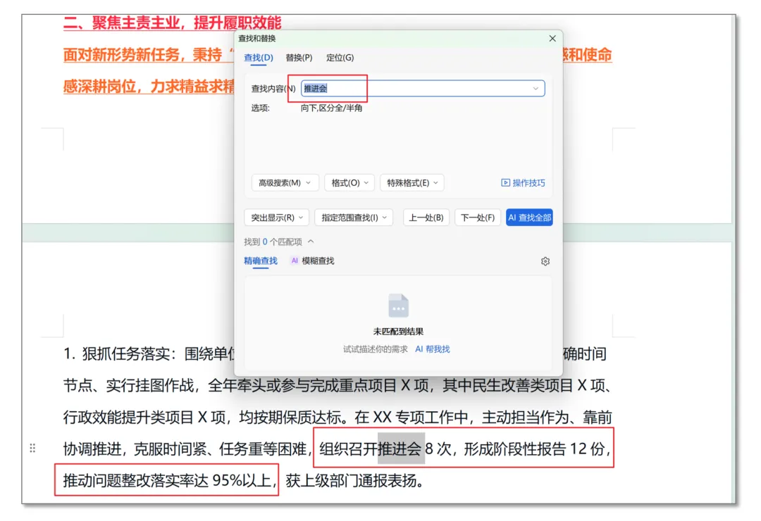 原则上,详细大纲里面的每个数据,我们都要到年终总结原文中去搜索一下。当然,如果是你自己写的年终总结,应该很清楚这些数据的,不是吗?直接把每个数据都看一遍,就OK啦!