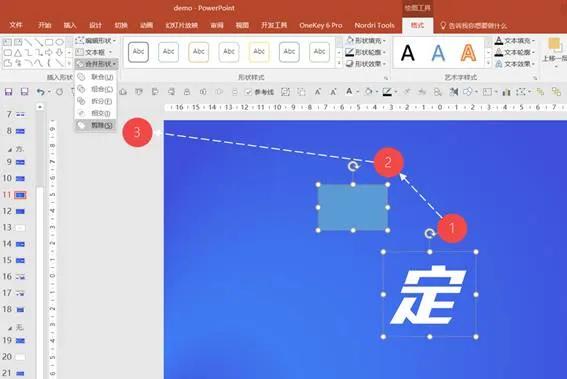 a. 在文本框外插入一个矩形,先选中「定」字,再选中矩形,单击【格式】-【合并形状】-【剪除】,得到矢量化的文字「定」。