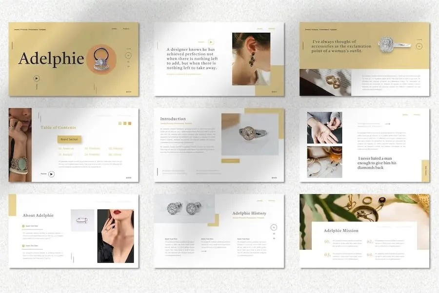 珠宝产品展示营销推广PPT模板,本套模板由顶尖PPT提供下载,模板支持PPTX等格式,适用于产品、推广、营销、珠宝等类型的需求。模板尺寸规格为1920×1080。效果预览图中的配图仅作示意,源文件不包含。下载即可获可编辑的源文件,轻松定制,满足您的多样化需求。