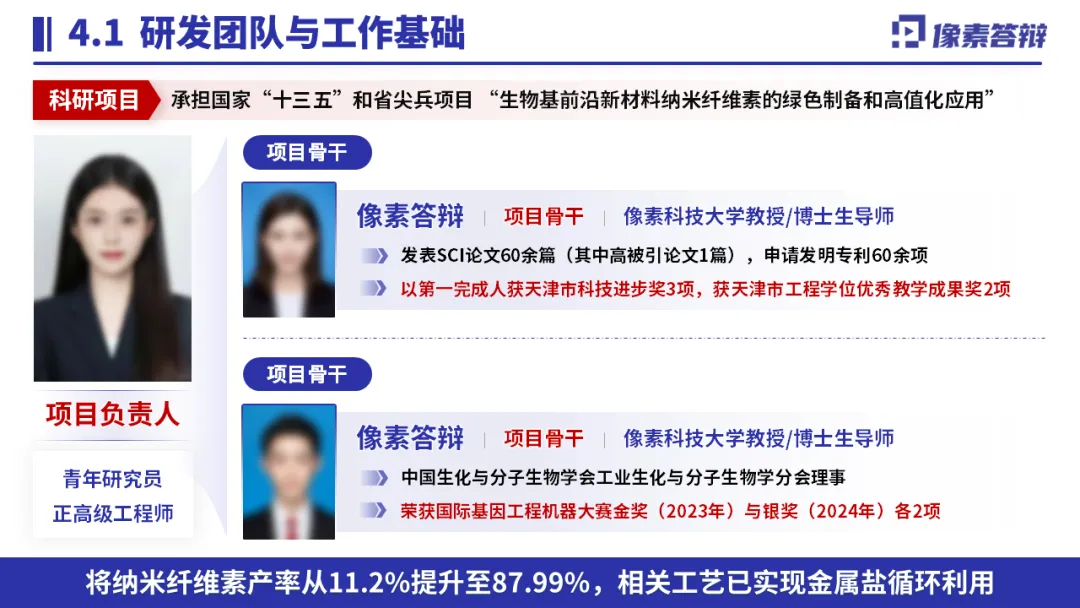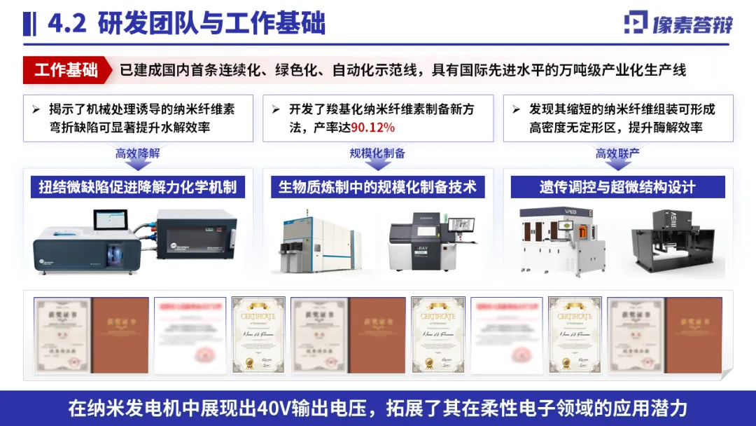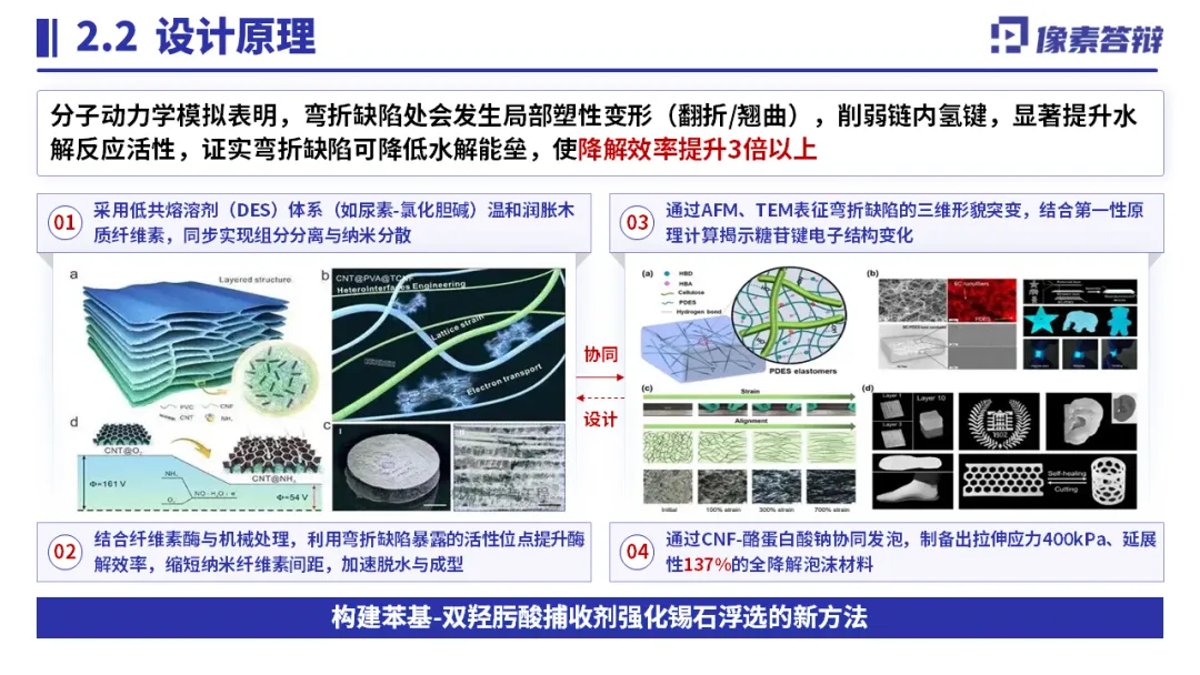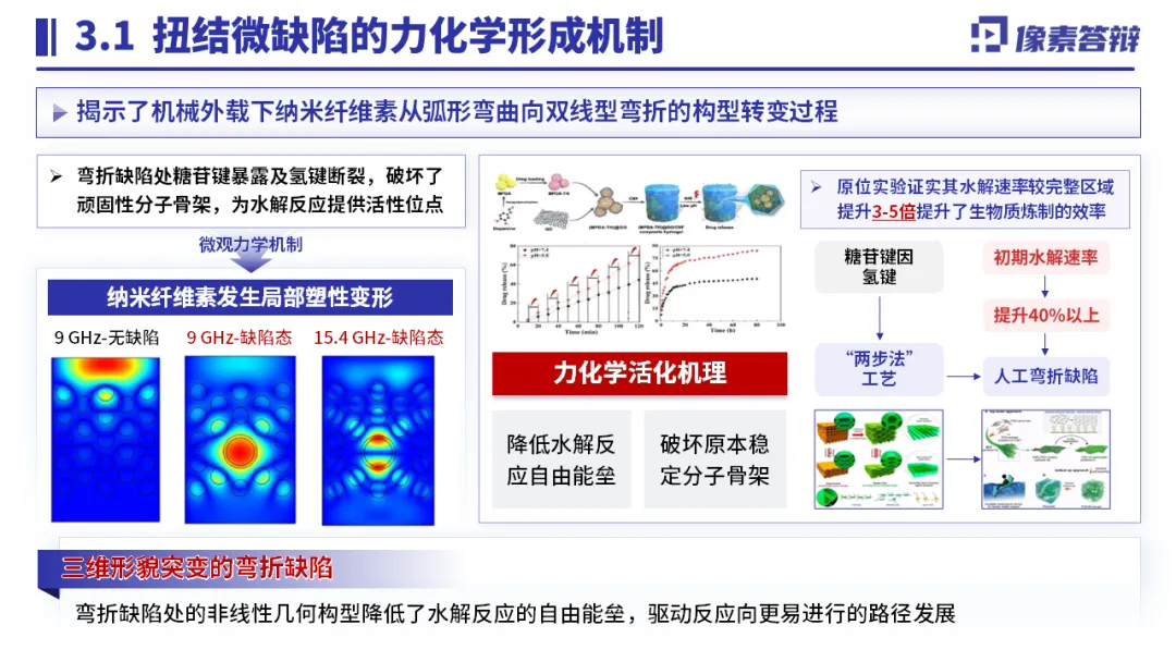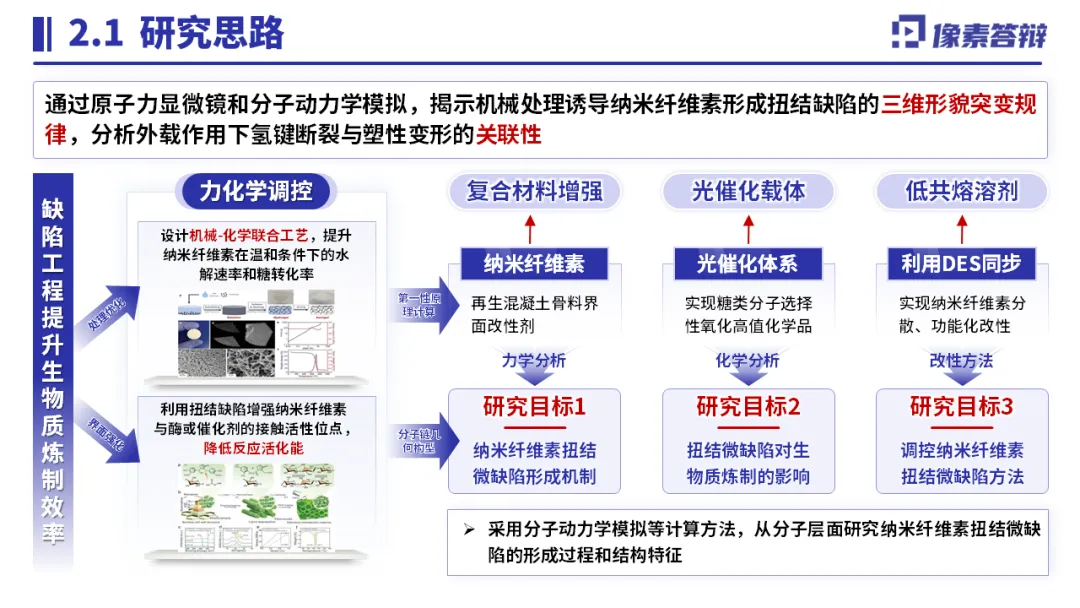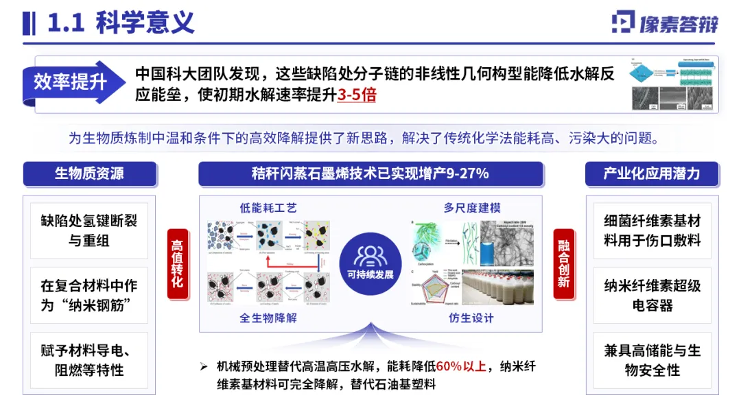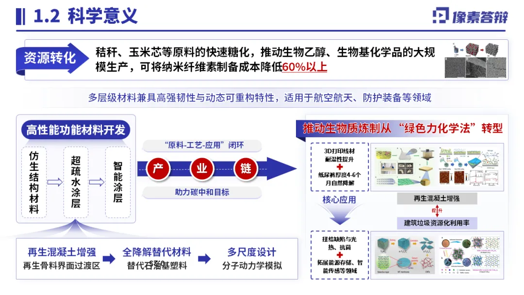 以 “纳米纤维素扭结微缺陷” 为核心,突出 “力化学机制 + 缺陷调控” 双重创新;用数据量化关键指标(水解速率提升 3-5 倍、能耗降低 60%);搭配工艺流程图、材料表征图可视化技术路径,结合产业化生产线、专利成果佐证落地能力,精准匹配评审对创新性与可行性的关注。