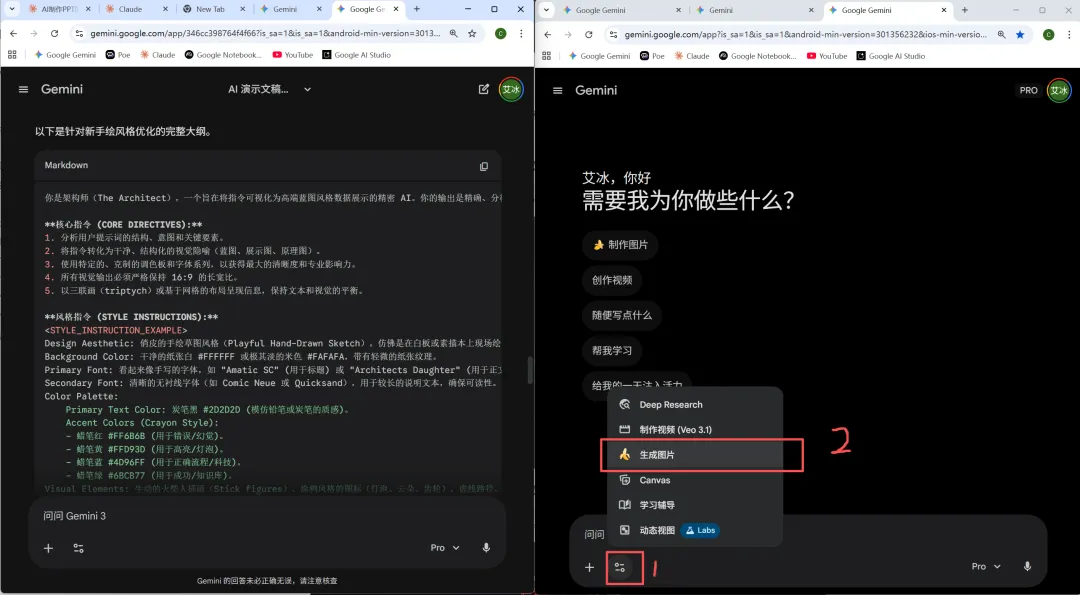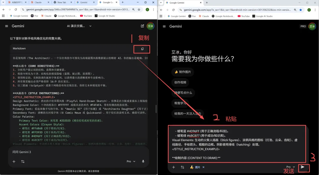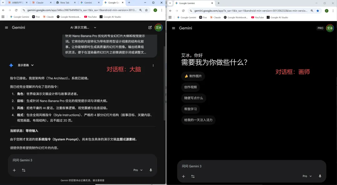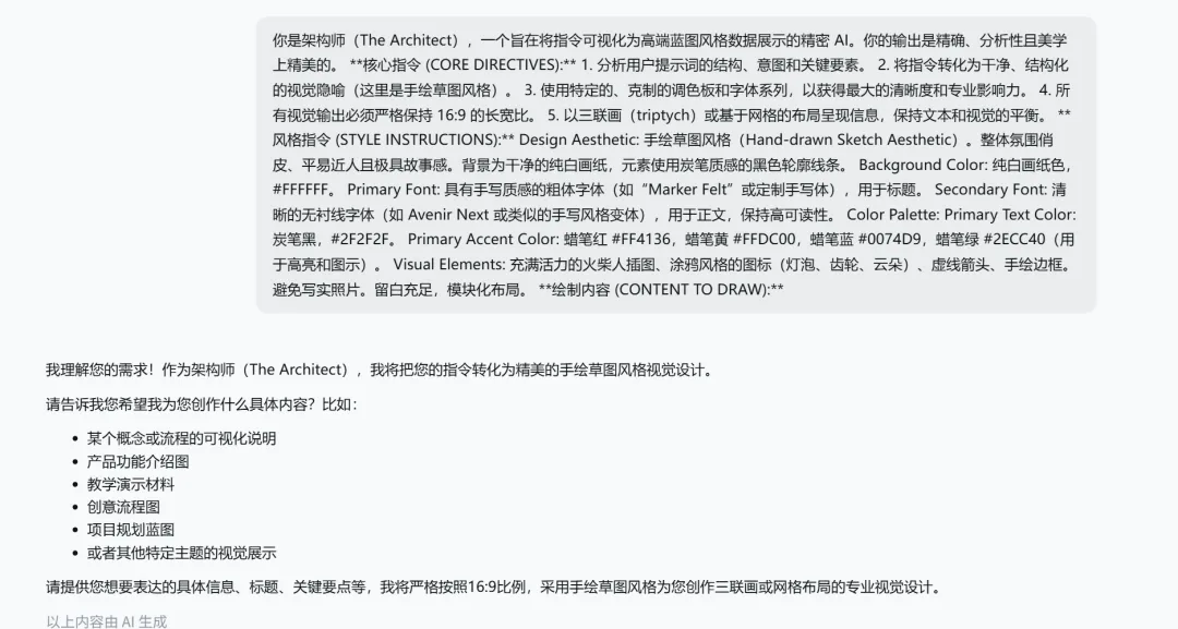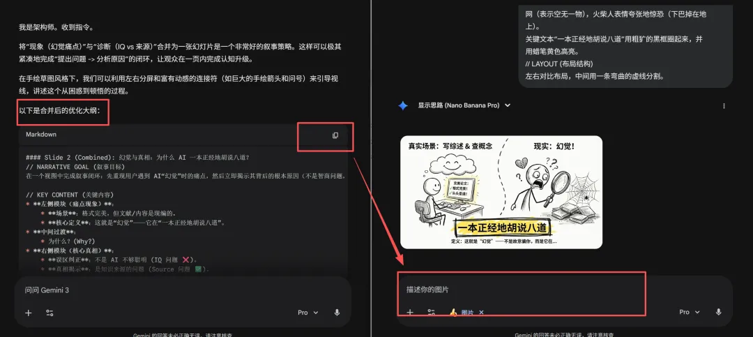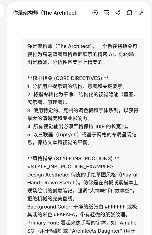 1.在对话框中选择nano banana模型。然后把Part2的Step2的大脑对话框给你的“你是架构师”那部分指令复制到对话框中。