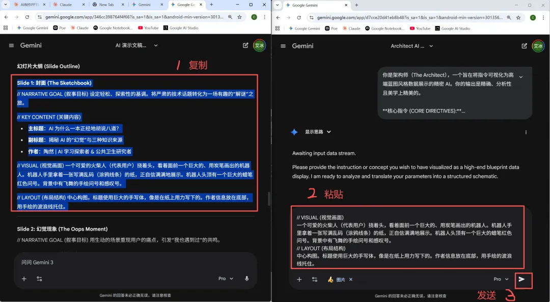 2.把Part2的Step2的大脑对话框给你的ppt画面一次性输入给对话框,对话框就会一次性批量出图!