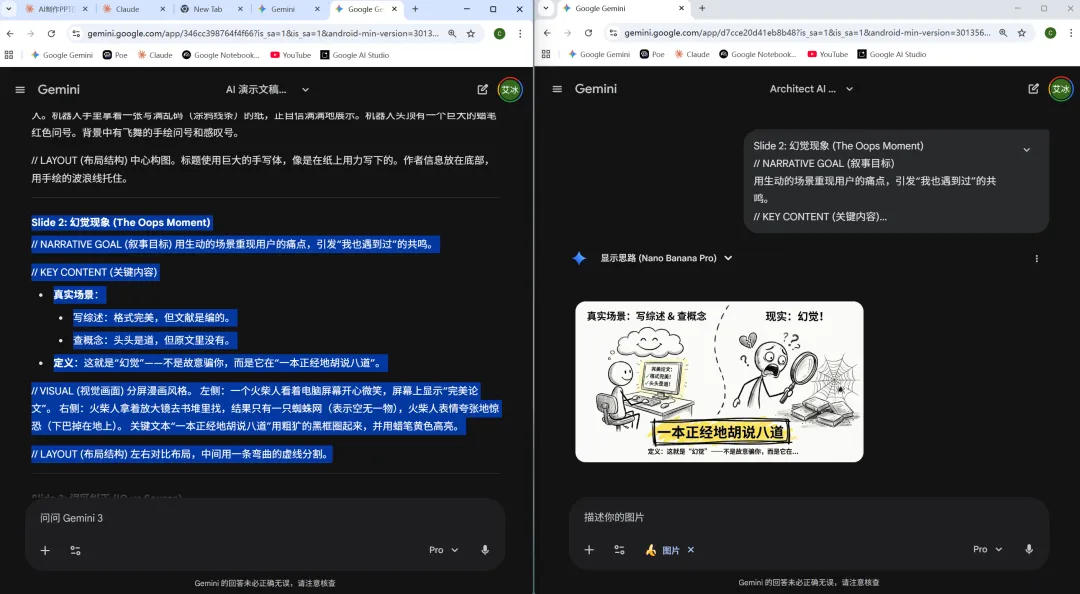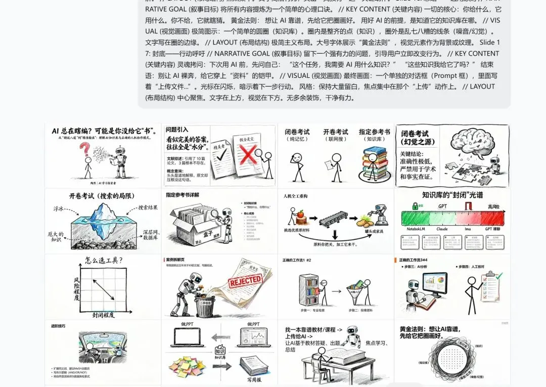 这样的好处是:NotebookLM负责整体框架(快),Nano banana负责精确内容(准)。