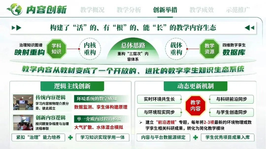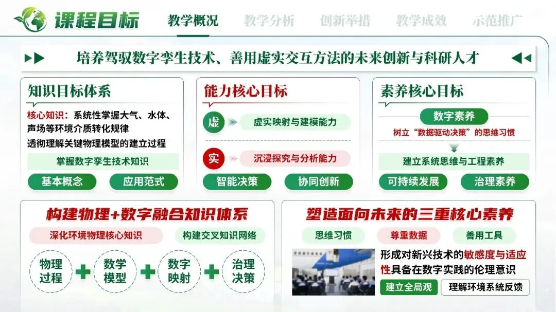 开篇直击数字孪生教学核心痛点(如技术实操高成本高风险、理论与产业场景脱节、跨学科融合不足),以 “数字孪生建模赋能,混合教学培育治理新才” 为纲定靶向;中段按 “课程定位 - 混合式设计-教学实施-创新亮点-育人成效” 展内容逻辑;结尾升华为 “技术应用-治理思维-实践能力” 三位一体教学新范式,形成 “问题-创新-实效” 链。