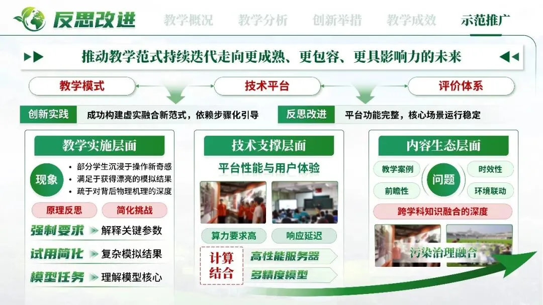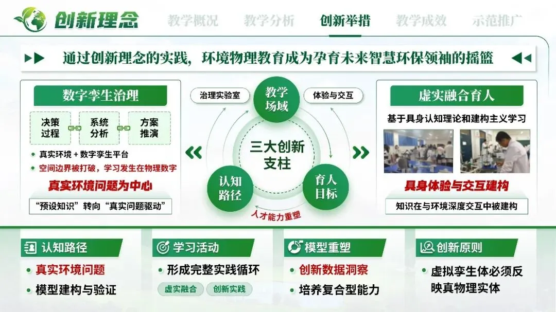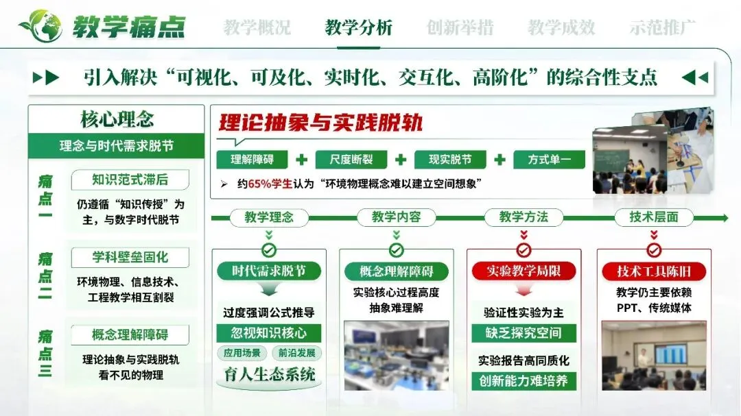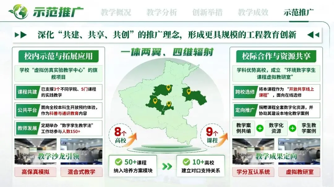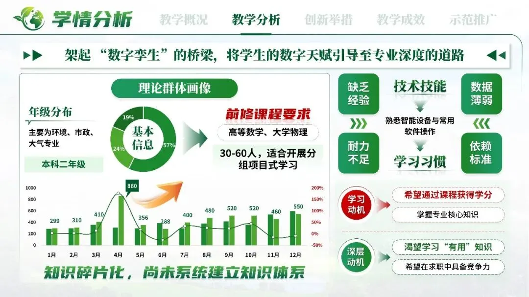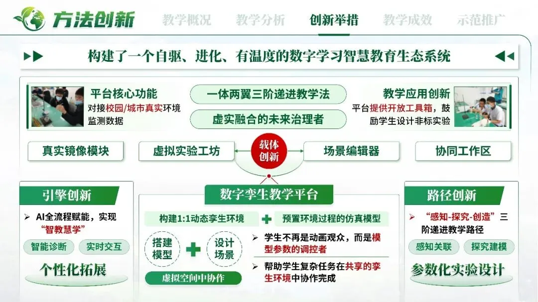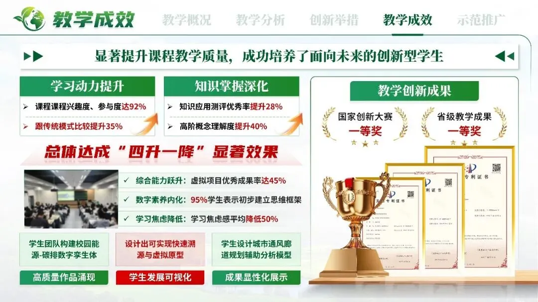 具象化三大教学成果,用数据图表呈现技能考证通过率、项目实践完成率等量化成效;从虚实融合教学、岗课赛证融通、跨学科能力培养三维显差异;方法依托 “线上虚拟仿真+线下实操实训+真实项目驱动” 模式,经 “数字建模-模拟治理-成果转化” 验证,强化技术落地性与治理思维培育实效。
