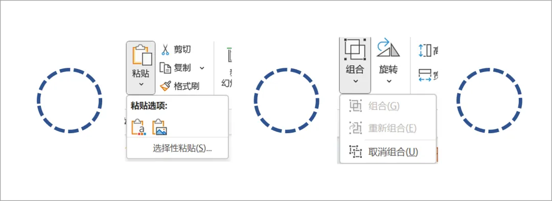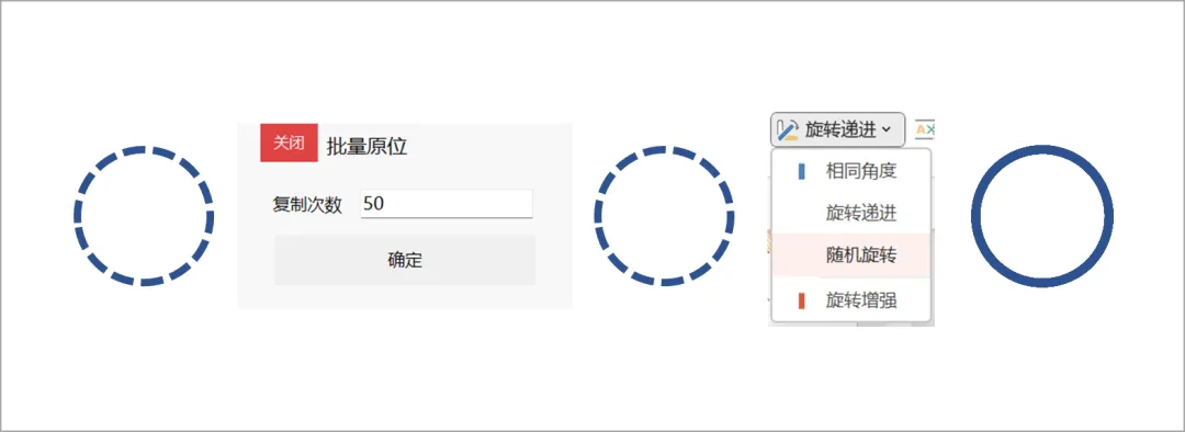 插入直径为3cm的圆形,无填充,线条宽度5磅,短划线类型设置为方点;复制圆形,在开始-粘贴-选择性粘贴,粘贴为图片(增强型图元文件),选择粘贴后的图片取消组合两次。