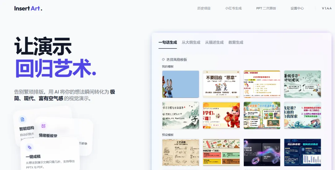 只需输入一个想法,AI将自动构思大纲、逐页生成描述,并生成最终成品。