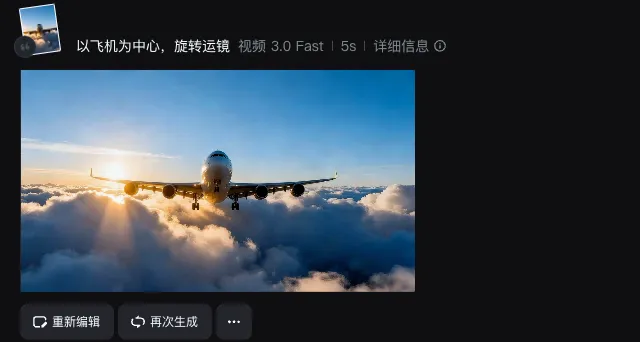 如果图片本身会“动”(比如海浪),你就顺着它描述。 如果图是“死”的,“祭出”我的“神级提示词”:“以飞机为中心,旋转运镜。”