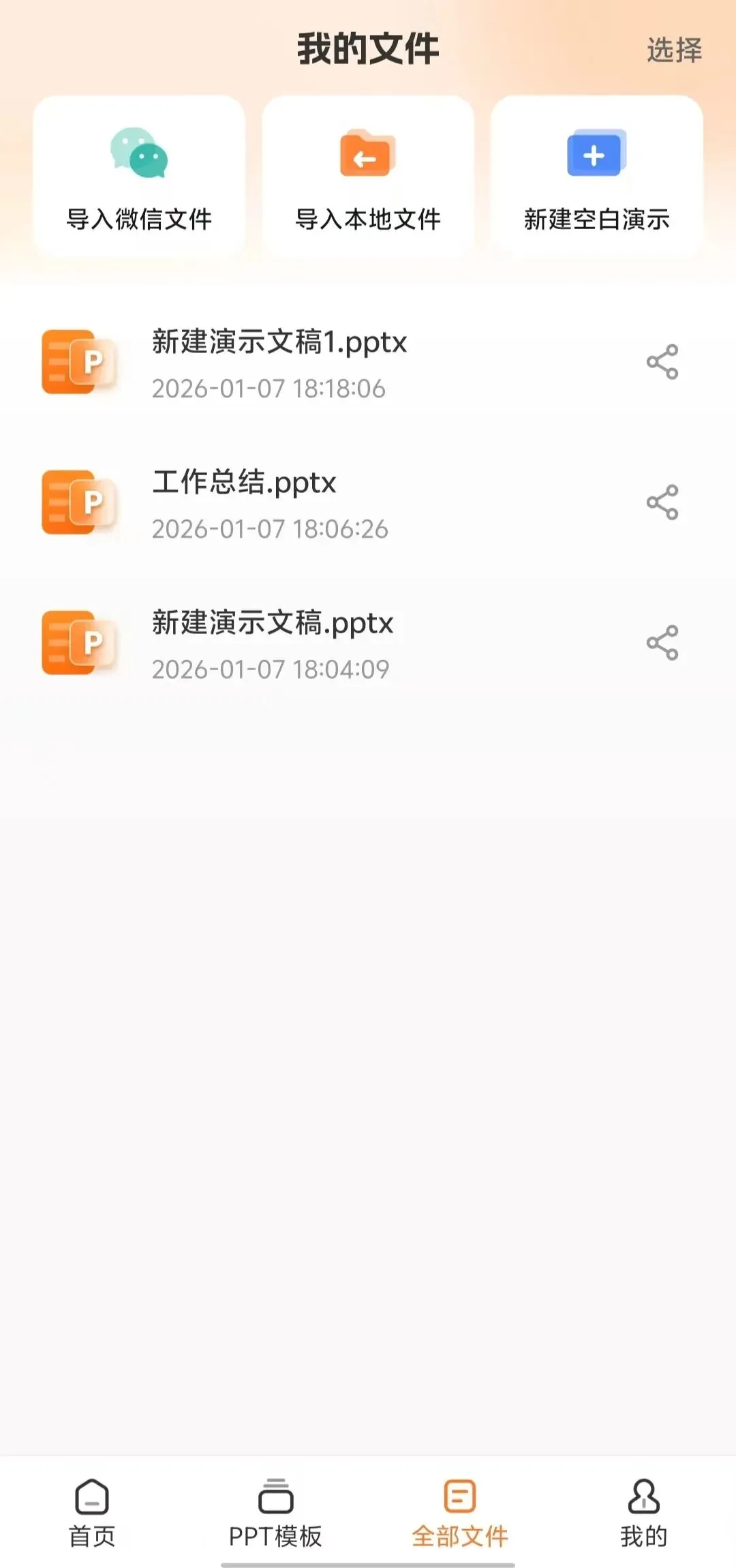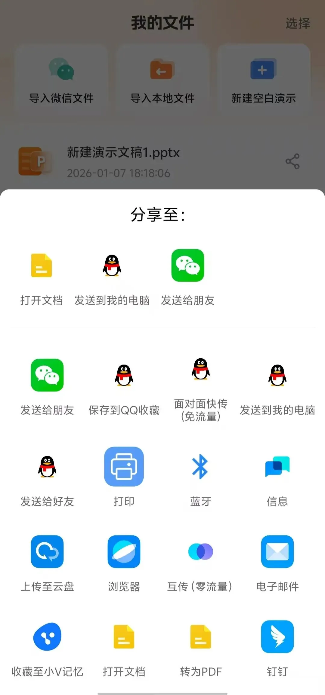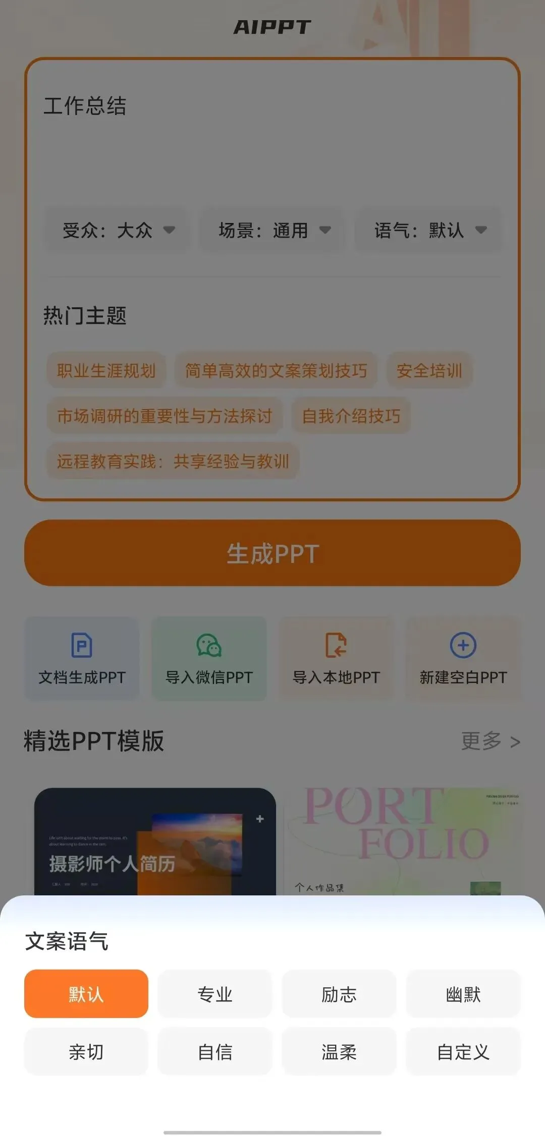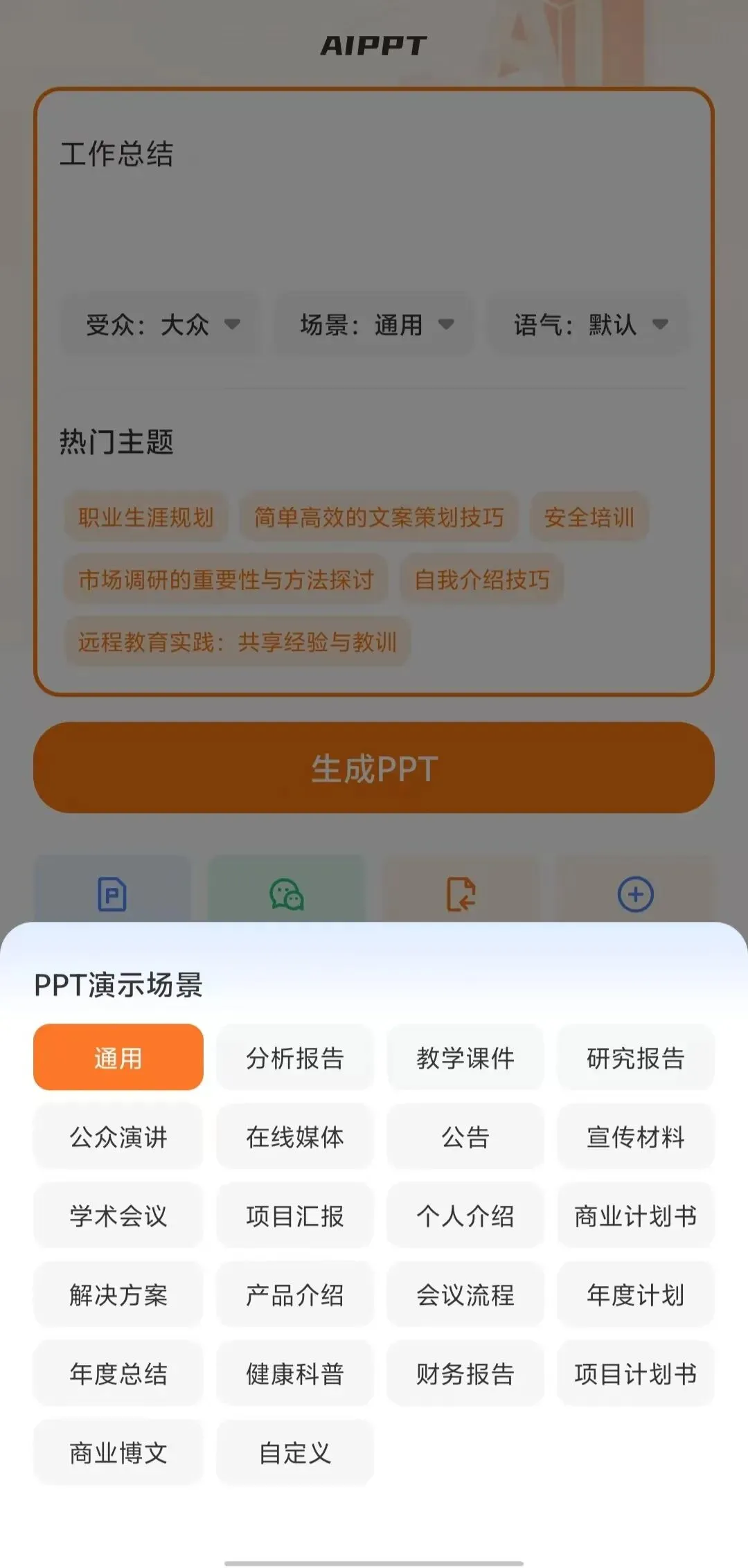 上班族、学生党都难免会遇见编写PPT的时候,经常写PPT的熟手还好,那小白编写或者不熟悉的主题或许就有点犯难了!今儿这款安卓手机端PPT模版生成器可以帮你解决棘手的难题。它不仅支持AI生成PPT,还有海量主题模版,一键生成你想要的PPT,还支持各项编辑,也可以发送PPTX格式到电脑进行编辑。有了这个PPT模版生成器,你还会觉着难吗?打开工具,首页有AIPPT、文档生成PPT(支持word,txt)、导入VXPPT、导入本地PPT、新建空白PPT,打开就是解锁特权到2099。AIPPT根据你选择的受众、场景、语气三个纬度来自动生成PPT模版。海量模版可以供选择,党政教育、培训汇报、节日庆典、医疗健康、推广宣传、营销策划、求职招聘、职业规划。一键生成的PPTX文件可以分享到VX、Q扣、或者保存到手机本地文件管理, 有了这个PPT模版生成器,不管你是上班族,还是学生党,不论你是编写工作总结还是方案策划,或者各行各业各种主题,我相信它都会辅助你提升效率,轻松编写应对!作者声明