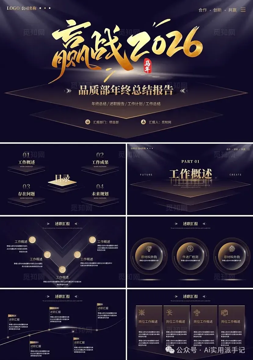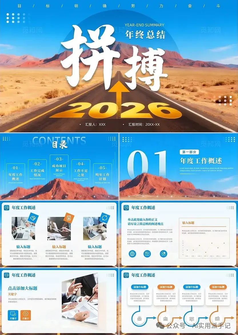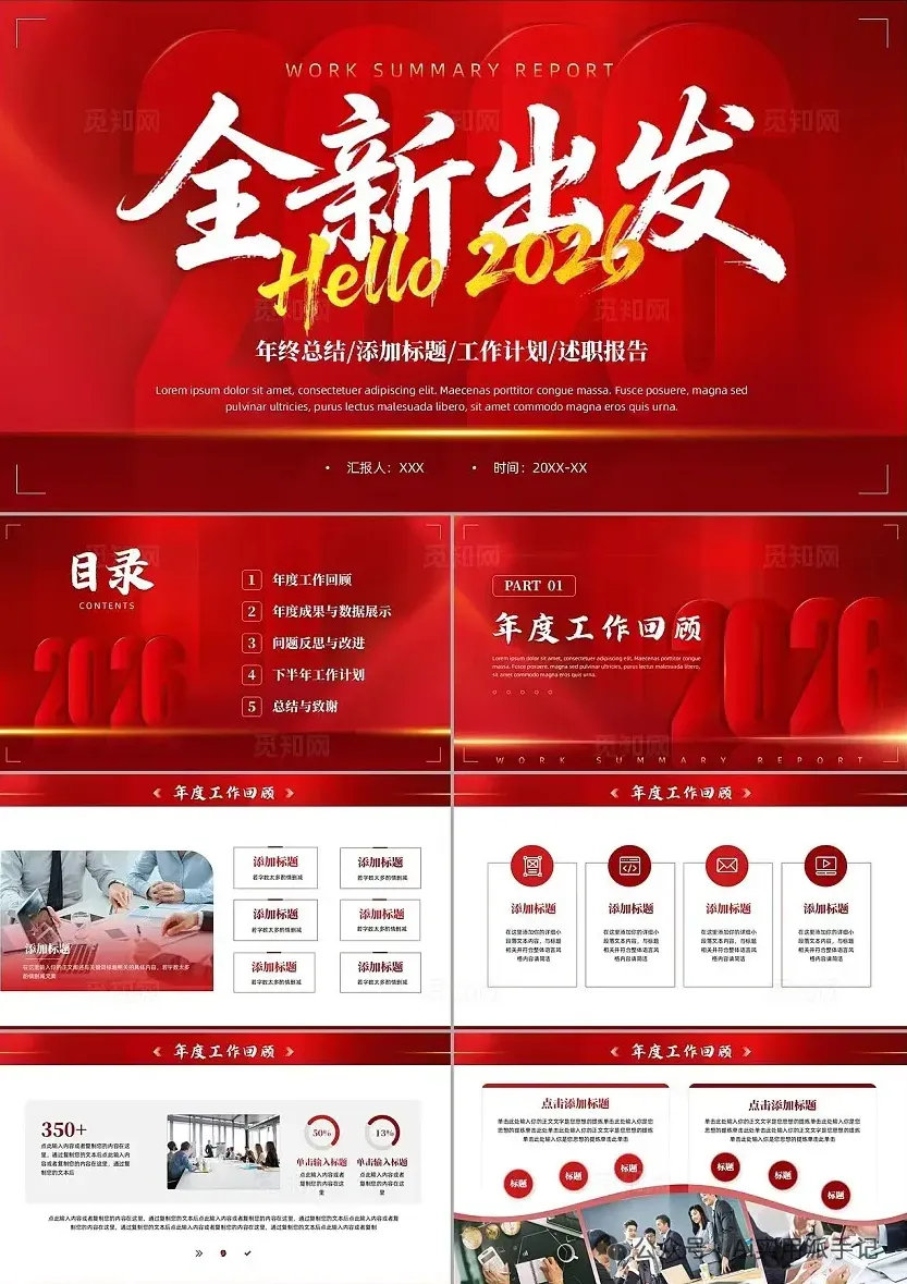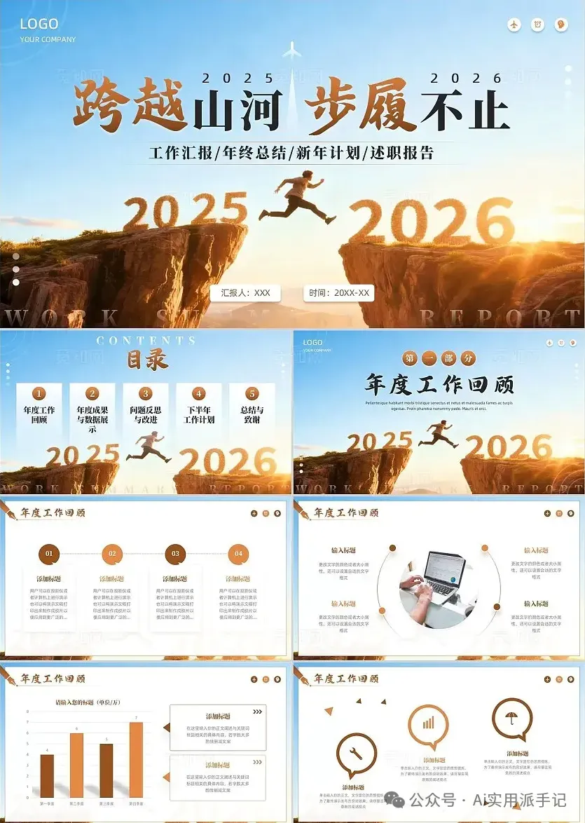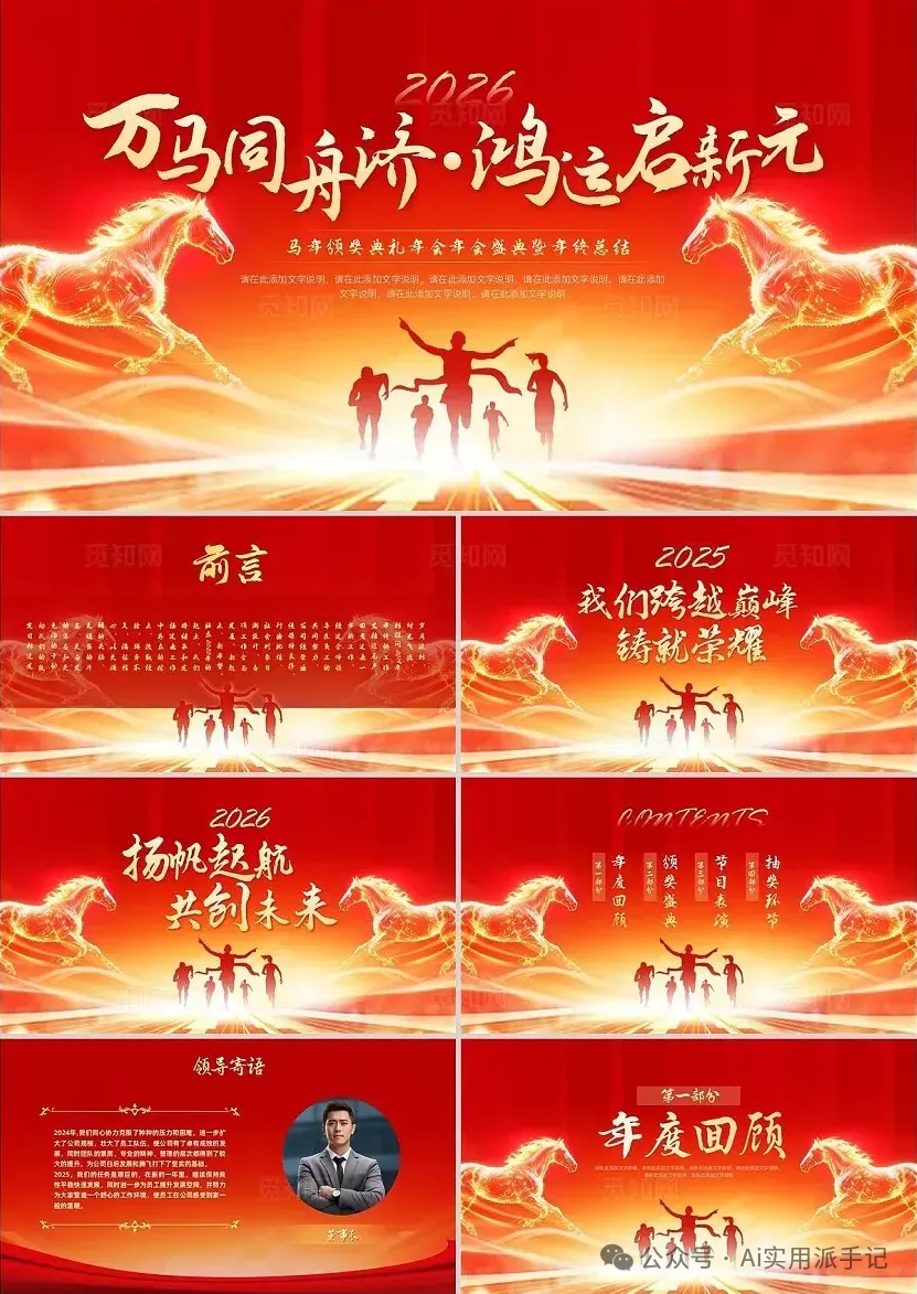 写年终总结总卡框架?这套马年模板直接帮你省 3 小时!10 套涵盖 “复盘 - 成果 - 反思 - 规划” 全流程,成果页能填 “汗马功劳” 式业绩,规划页可列 “策马前行” 式目标,连致谢页都配了 “龙马精神” 吉祥语。重点模块用色块区分,数据能嵌动态图表,不用懂设计也能做出逻辑清晰、颜值在线的汇报课件!获取免费方式👇