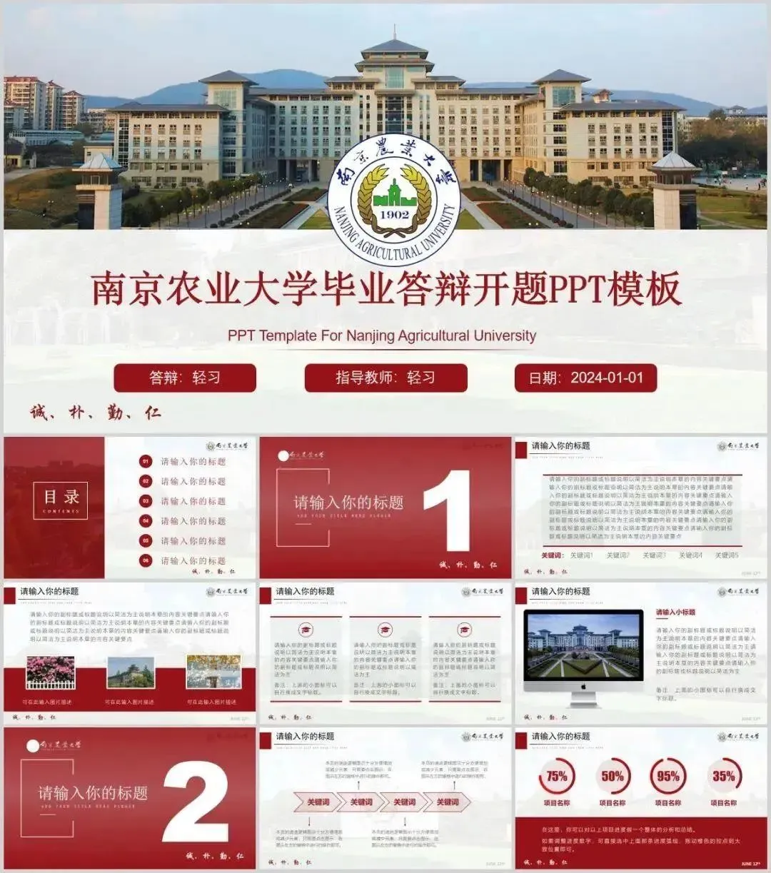 包含了高校专属校徽,100+套精选PPT,正式大气中又不失高级活泼,很能展现个性与品位,适用于各种毕业答辩、总结汇报、活动策划、个人简历、宣传推广等场合。快快收好! 诚 朴 勤 仁