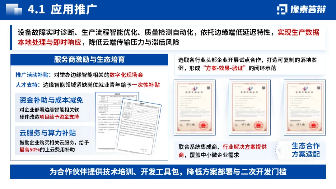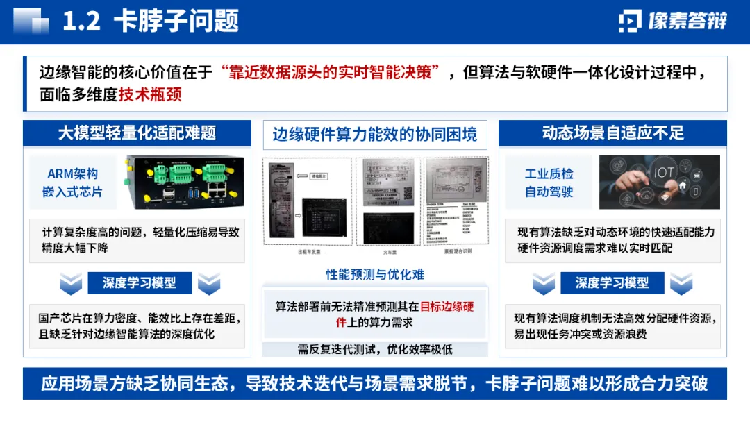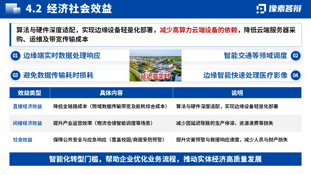 围绕 “边缘智能”“软硬件一体化” 等核心关键词展开,痛点先行凸显项目必要性。通过标题加粗、层级划分等方式,区分核心观点与支撑论据,避免信息过载,让创新点和项目价值一目了然。
